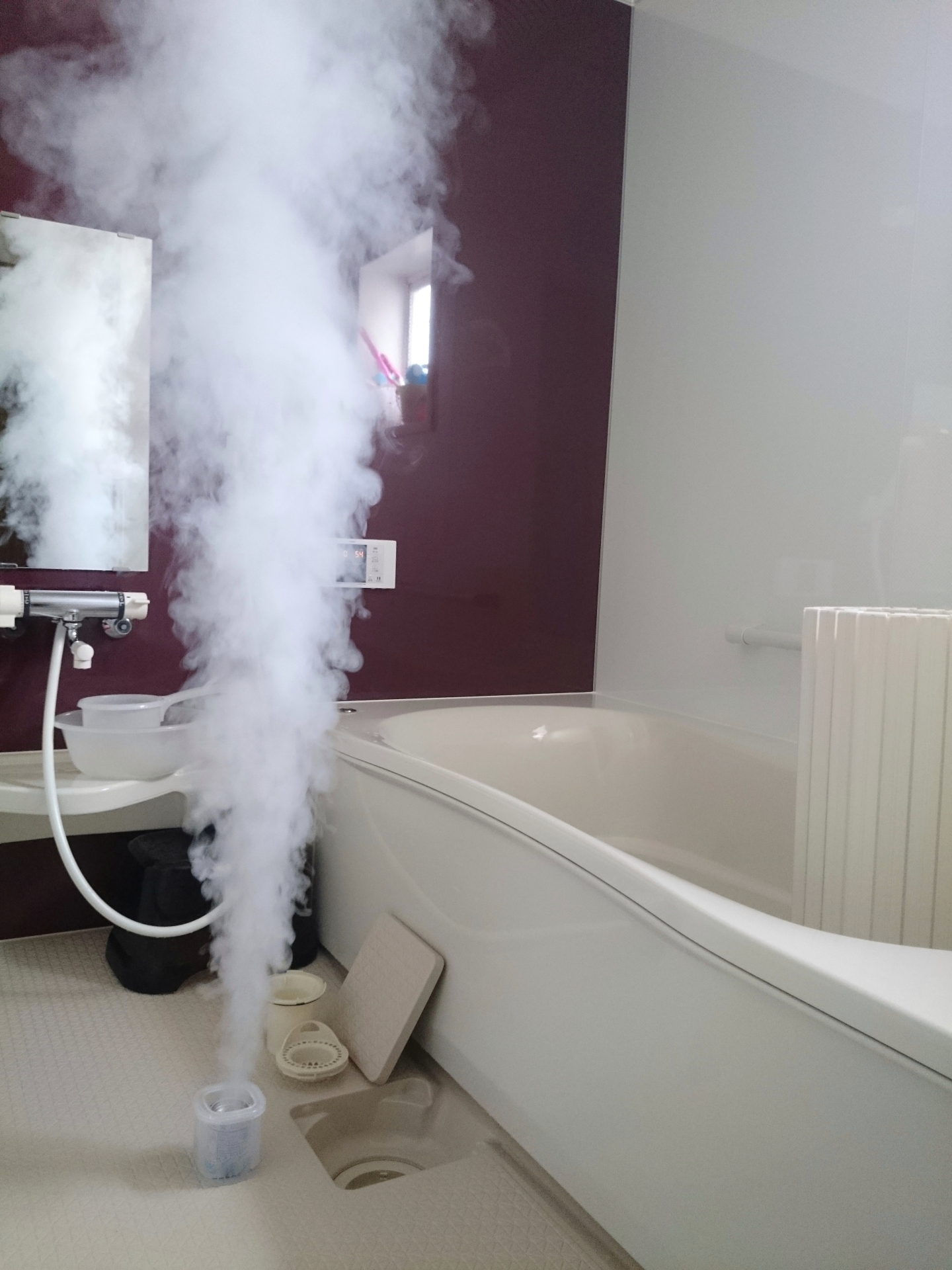 薬剤に水を入れると一気にモクモクと煙が!(※毒性があるので、換気は止めて浴室ドアも必ず閉めてください)