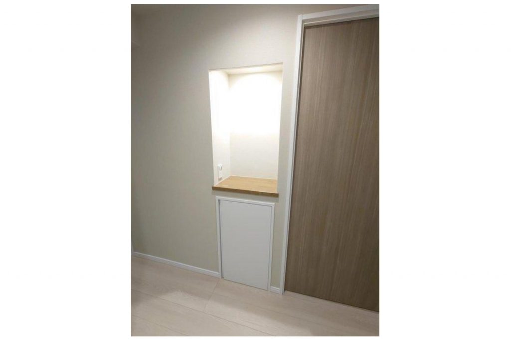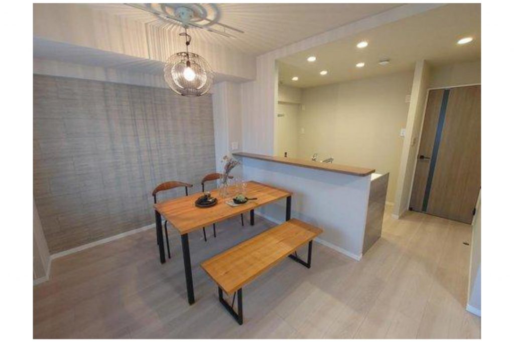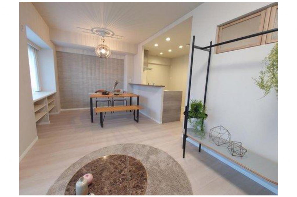 15.1帖の横型LDK。ダイニング窓際には小物がしまえるちょっとした棚が備え付けられています。