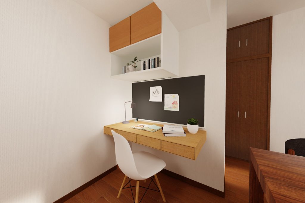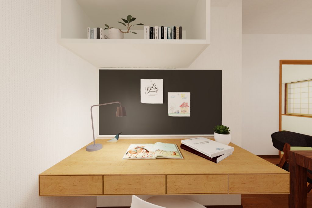 引出し付きのカウンターと、上部に吊戸棚を設置して作業スペースを新たに作りました。