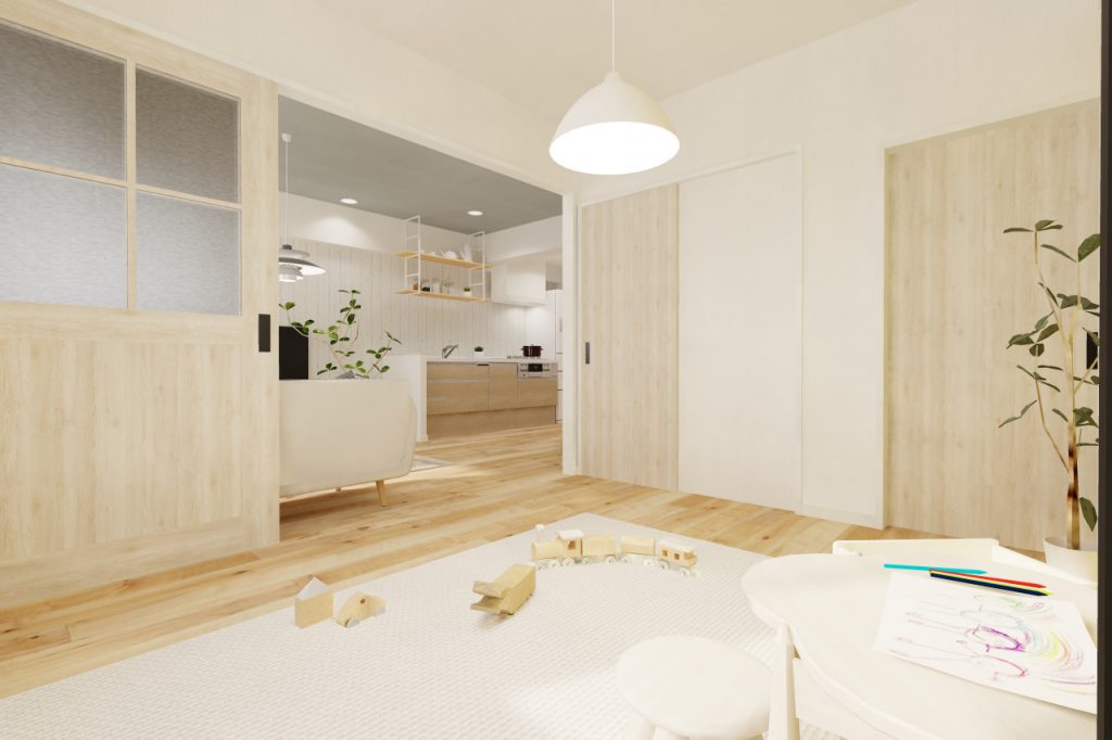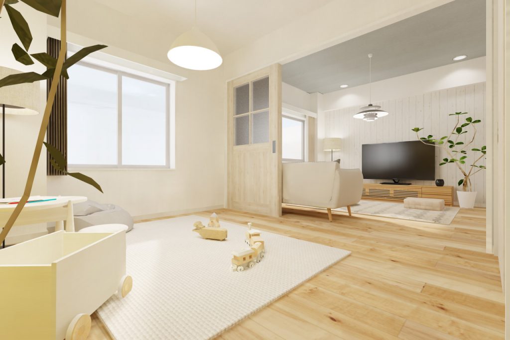 いつもは個室として。来客時やお子様が遊ぶスペースにしたい時には、引き戸を開け放ってLDKと繋げて使うことができます◎