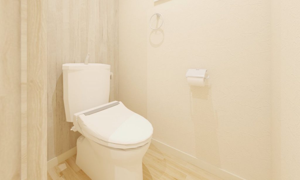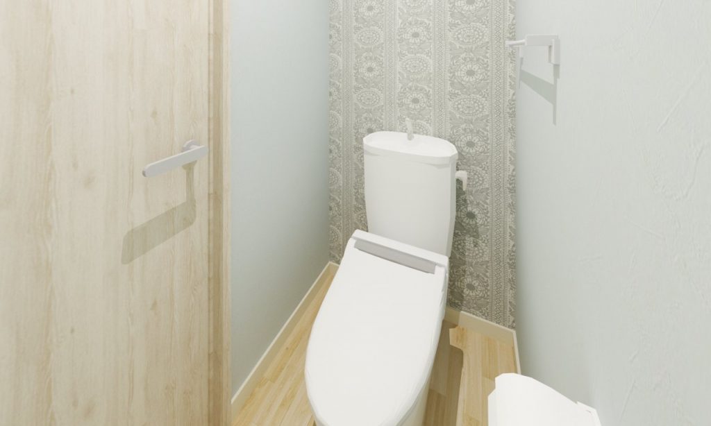 トイレは清潔感ある水色を基調として、トイレ背面にはエレガントな花柄のクロスを貼りました。