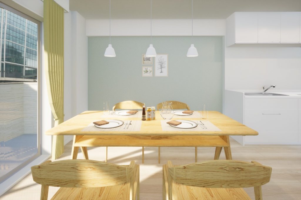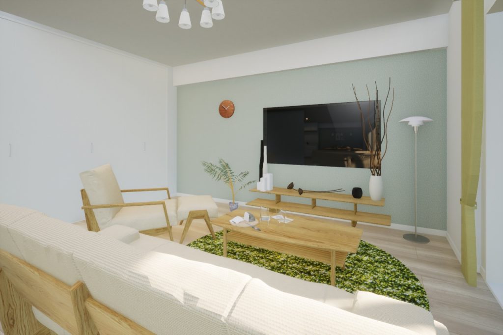 壁1面には、淡いグリーンのアクセントクロスを貼っています。