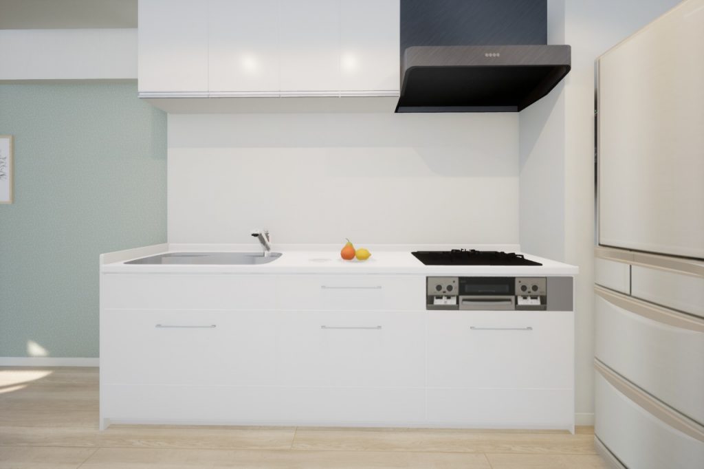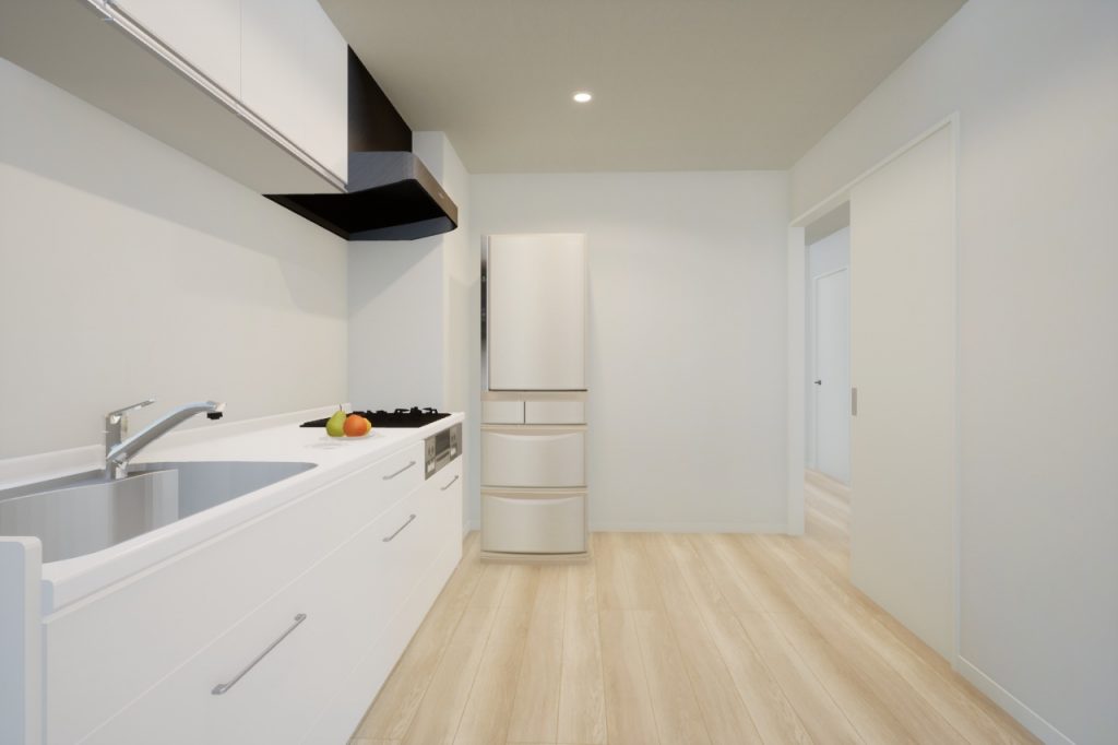 キッチンの背面には壁を延長して、キッチンが丸見えになるのを防ぐ&背面に収納を置けるように改善しました。