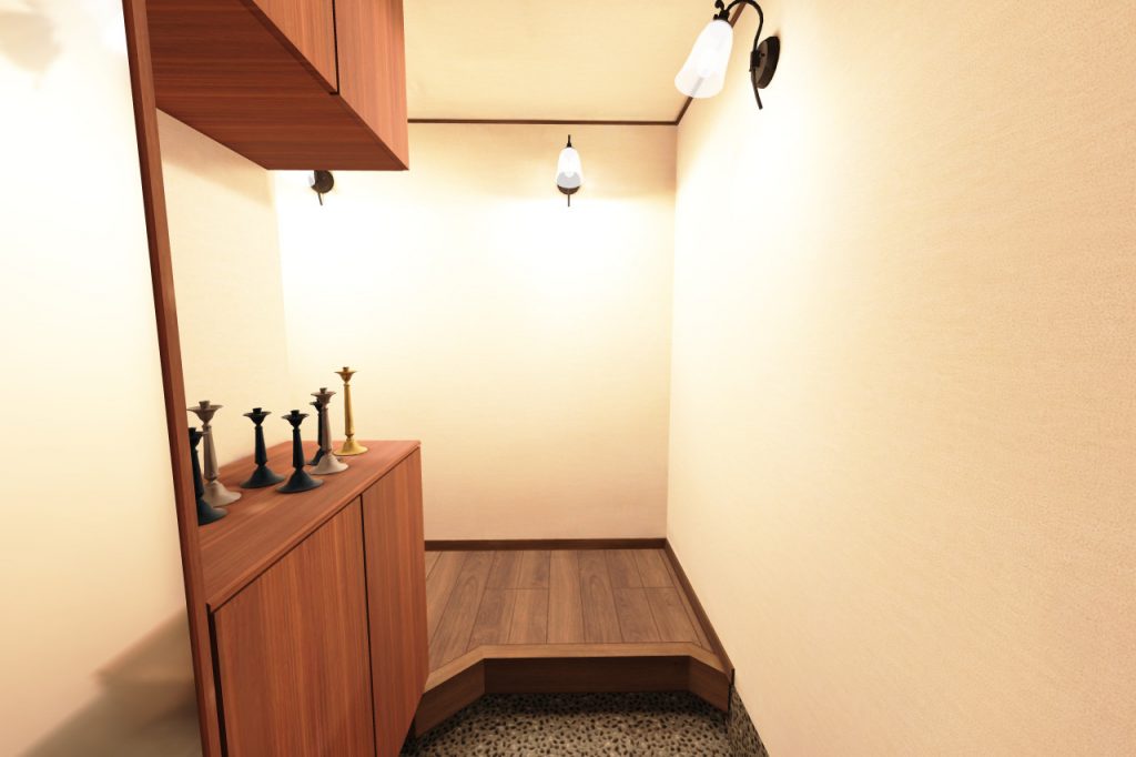 玄関を開けると落ち着いたダークブラウンで統一された和風の空間が広がります。