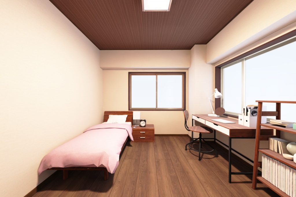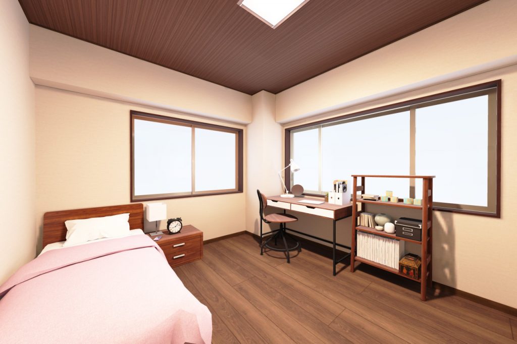 天井に木目クロスを貼って落ち着いた部屋にしました。