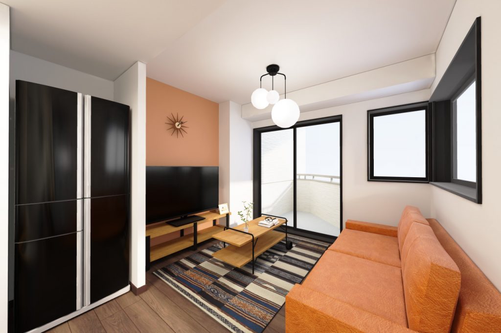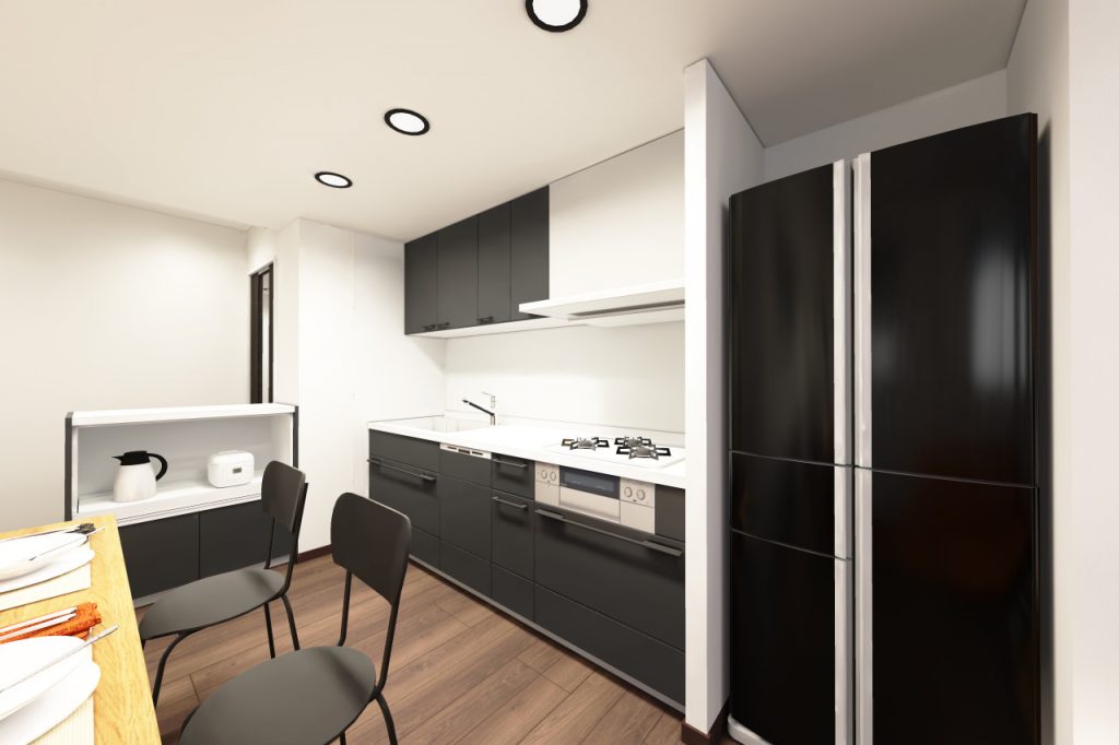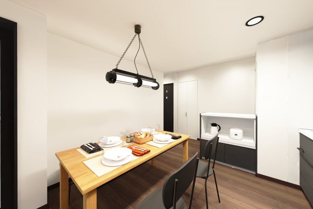 4DKから2LDKになり、収納も充実して使いやすくなっています。シンプルな中に少しパンチのあるクロスを取り入れたモダンなテイストにしました。