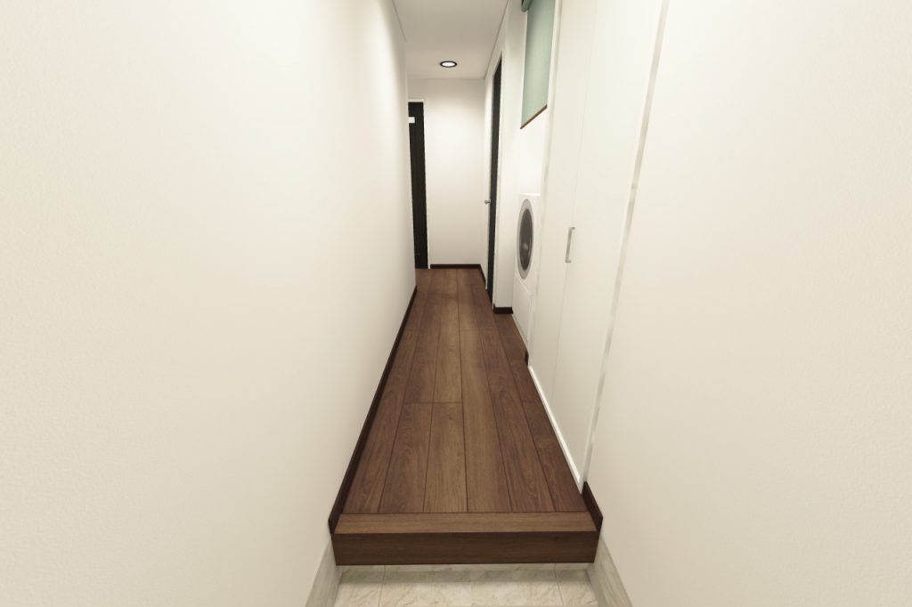廊下突き当りを曲がると、洗面所・浴室の入口とリビングの入口があります。