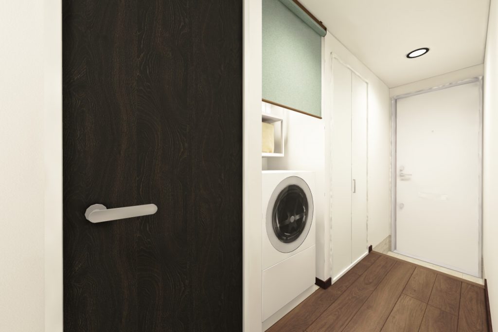 洗濯機置き場はロールスクリーンで目隠しをしています。