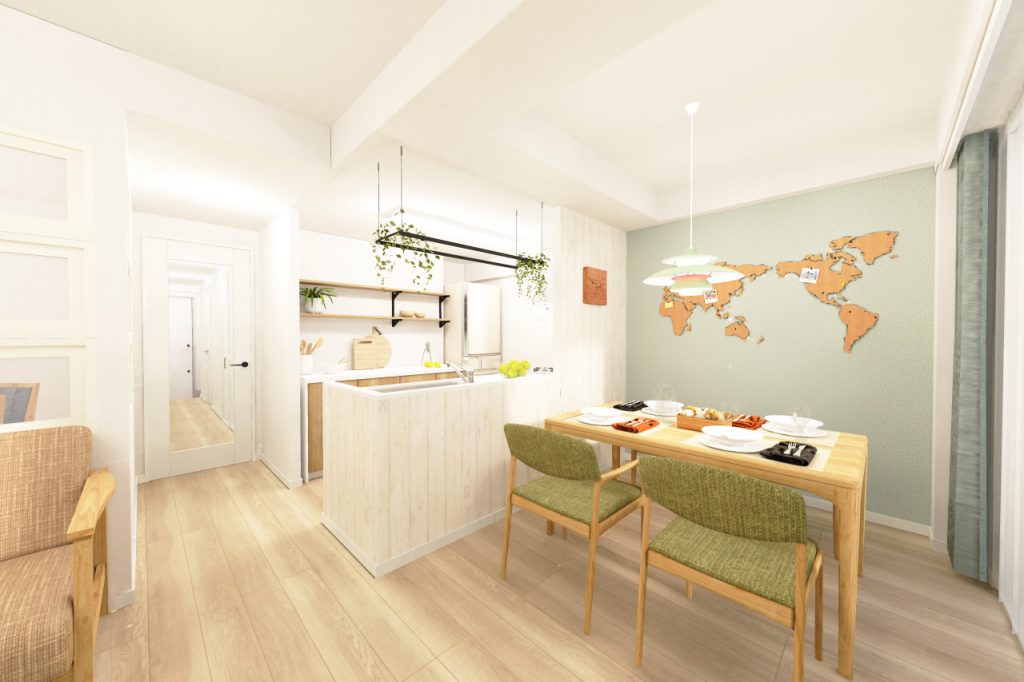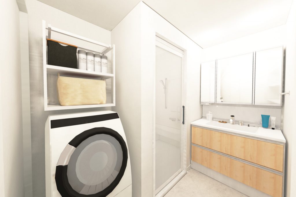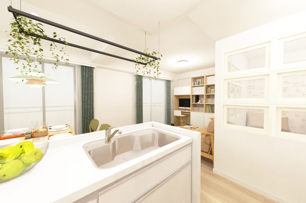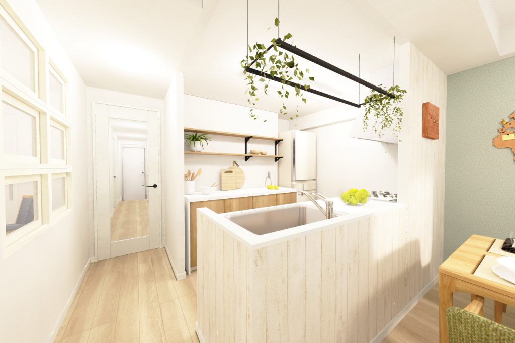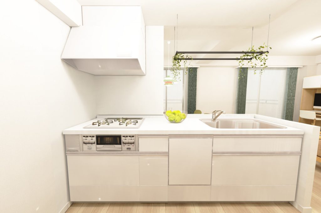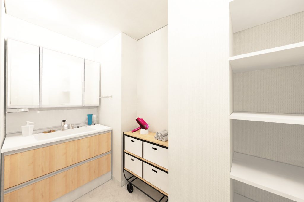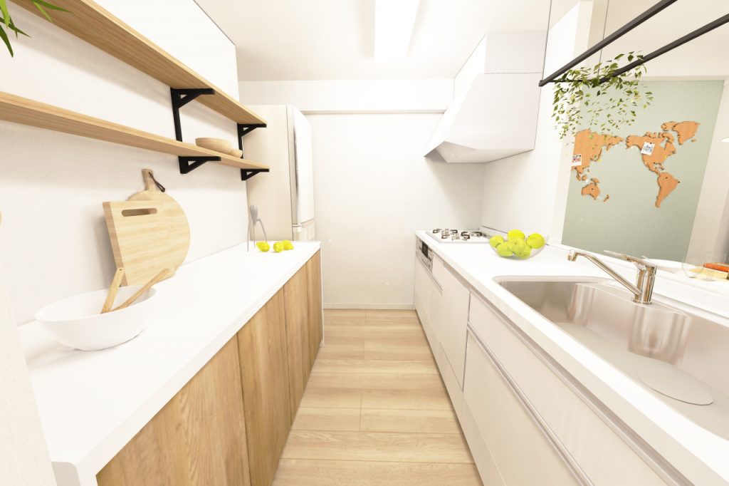 キッチン収納がある壁は洗面所との出入り口がありましたが、壁にしてキッチン収納を目一杯置けるように変更しました。収納力がアップしました。
