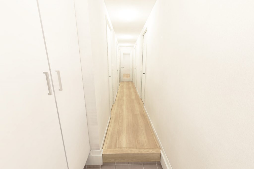 キッチンとの出入口(引戸部分)を壁にしたため、ちょっとした収納が置けるようになりました。