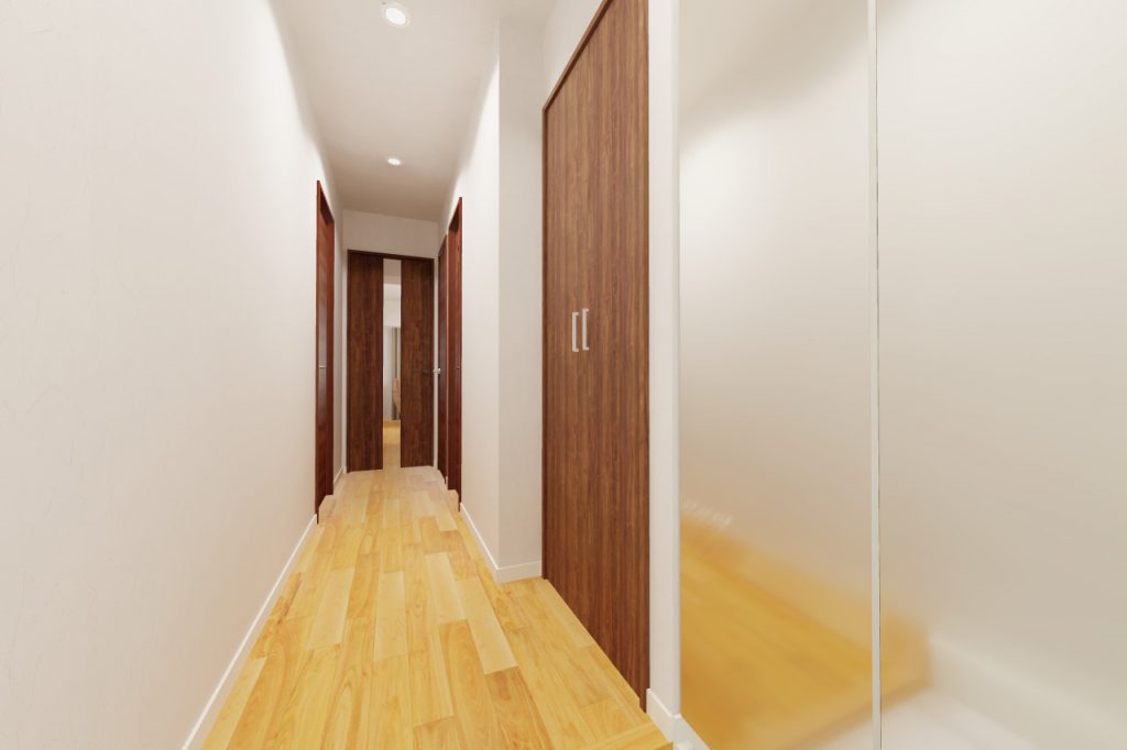 廊下突き当りのドアがLDK、左側がお部屋、右側が洗面所に繋がります。
