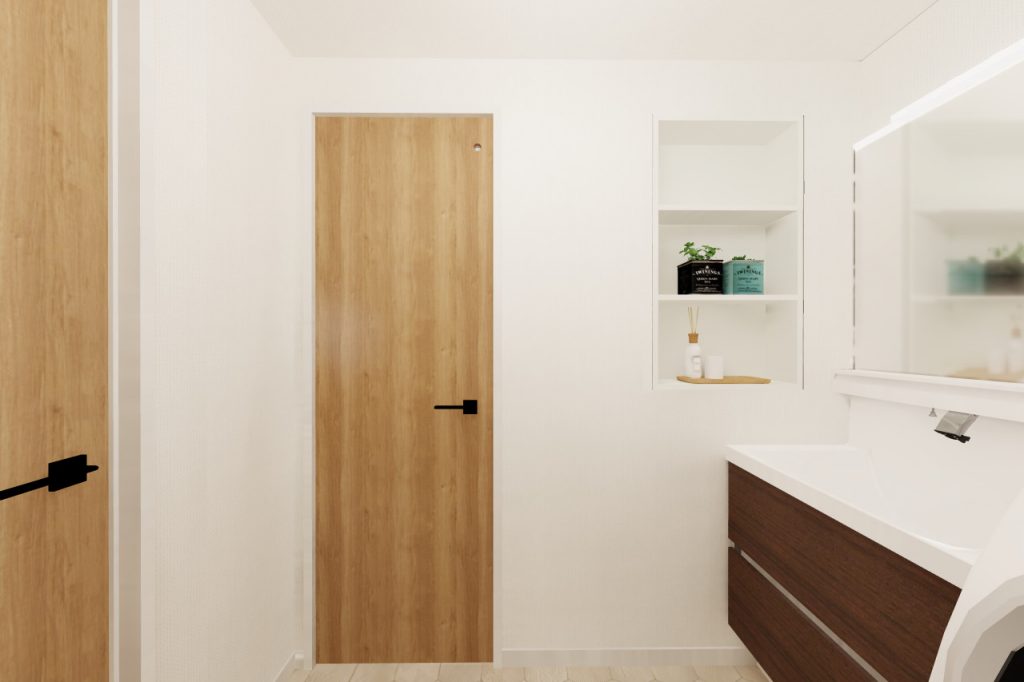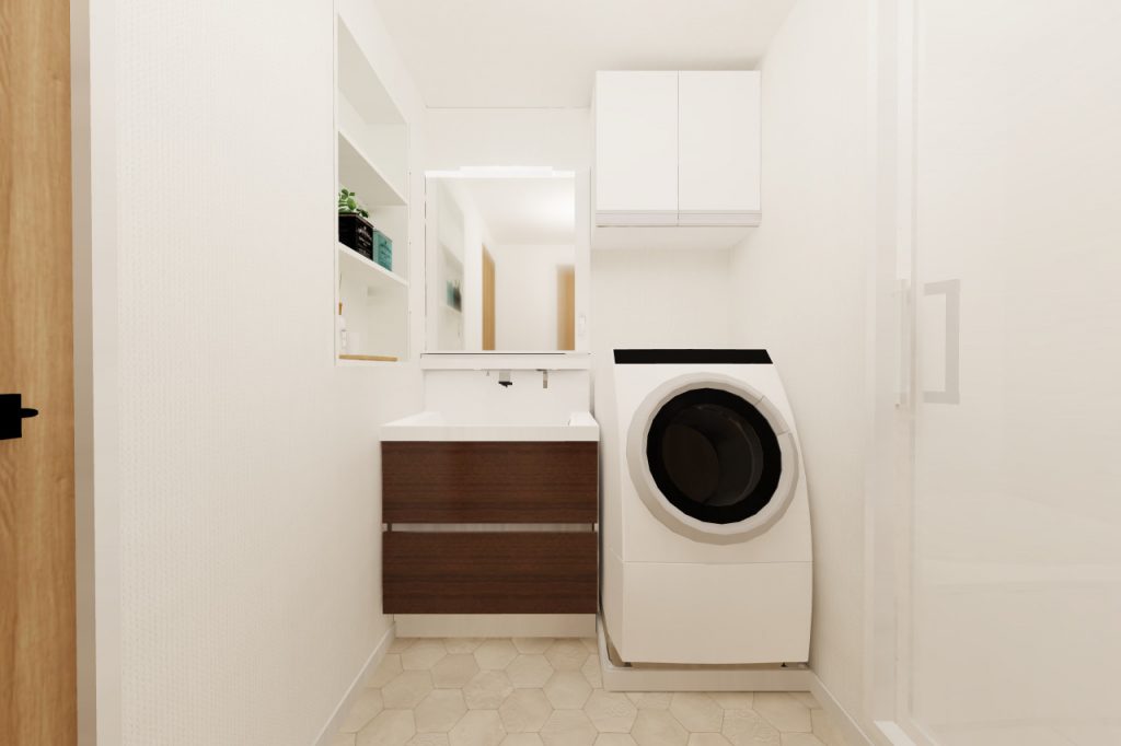 洗面室は廊下との間に扉を設け、洗面台と洗濯機置場の位置を交換することで使い勝手UP!