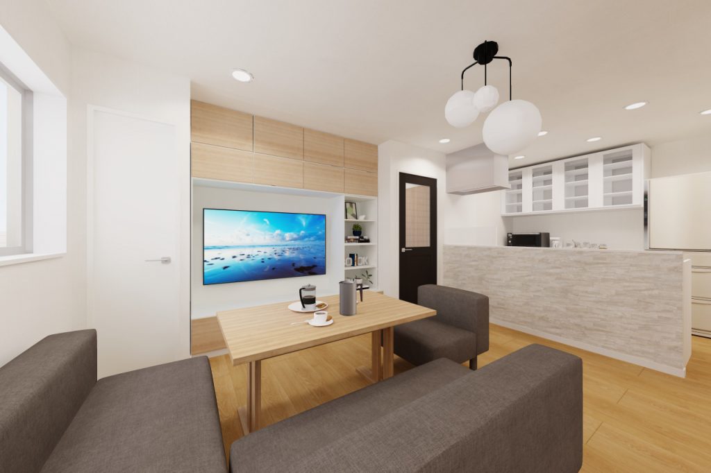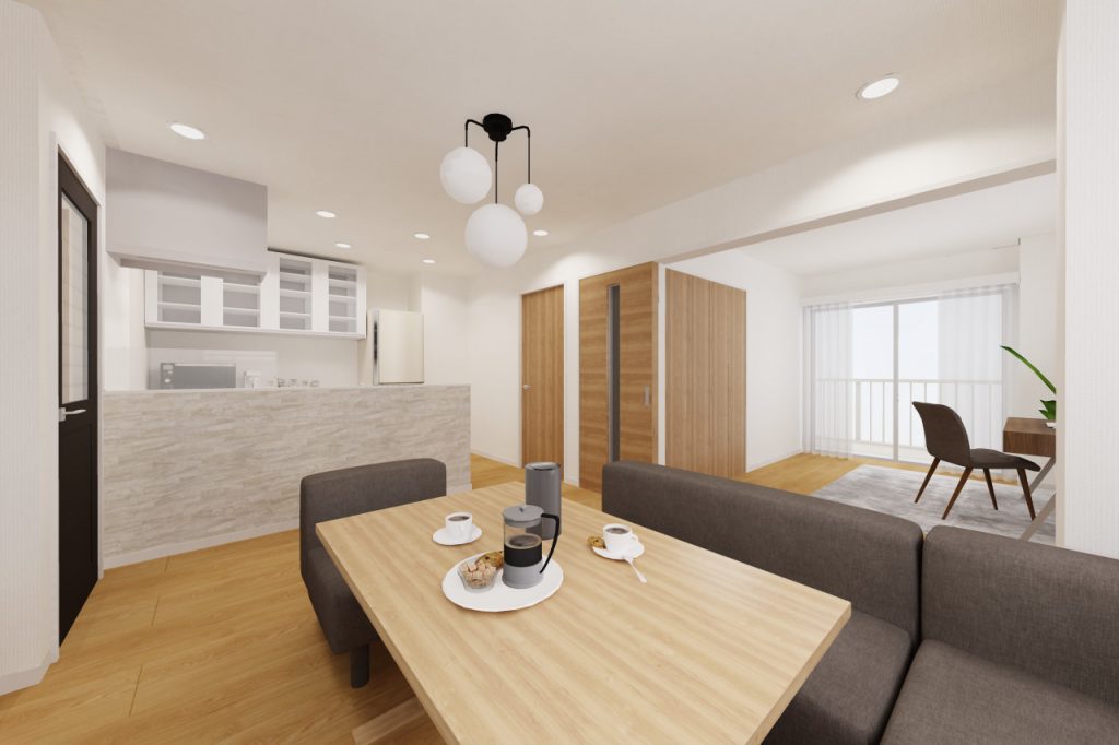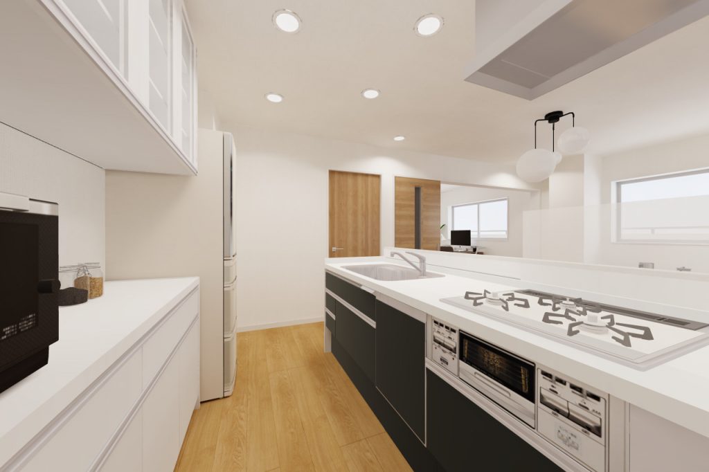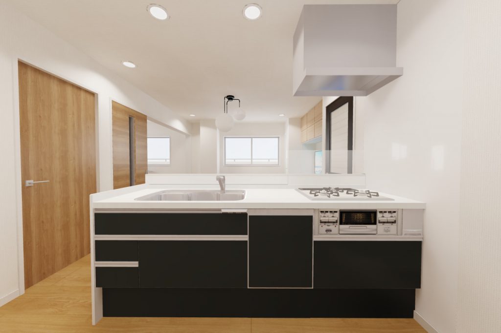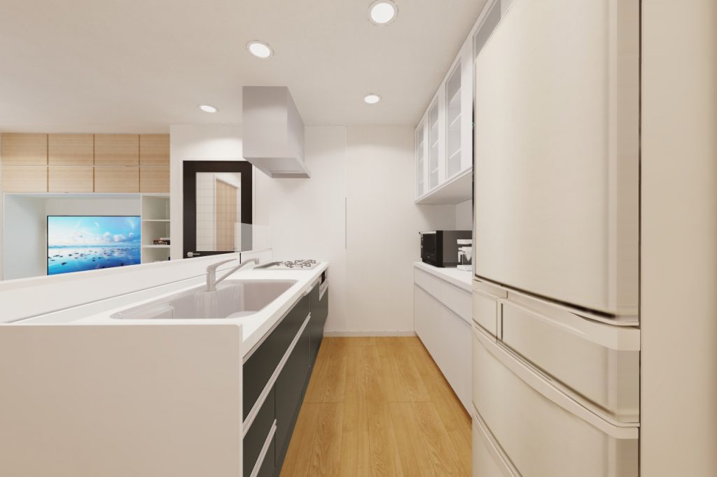 既存では壁付になっているキッチンを、向きを変えて対面式キッチンに。