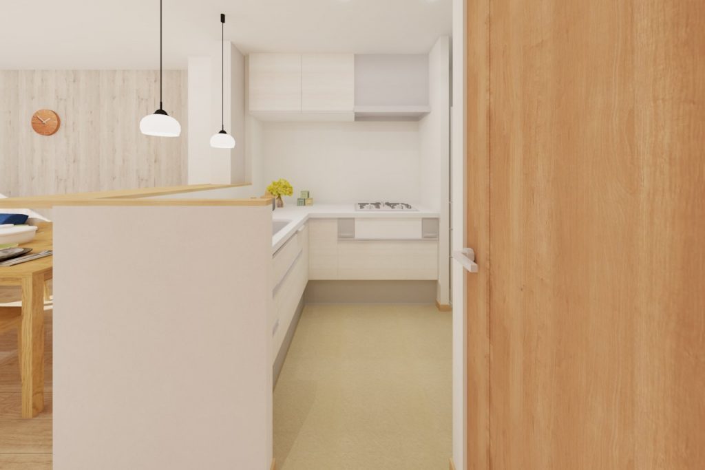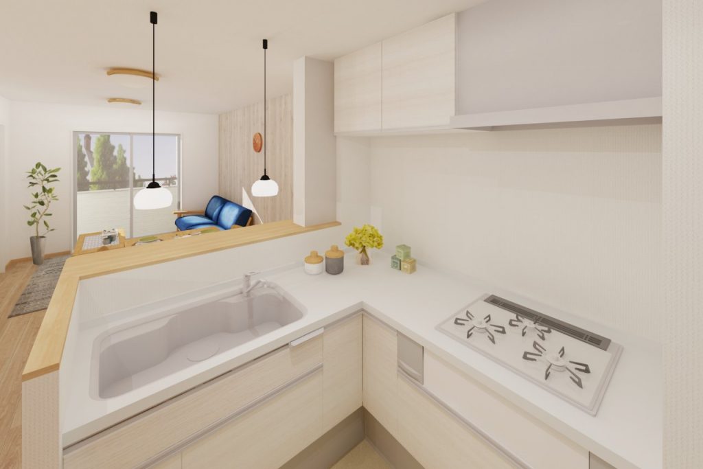 シンク周辺の壁は腰壁にしたので、視線が開けて広々見えます。