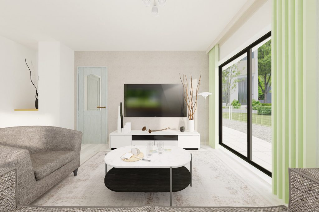 床のグレイッシュカラーとのバランスで、グリーンがより魅力的になりました。