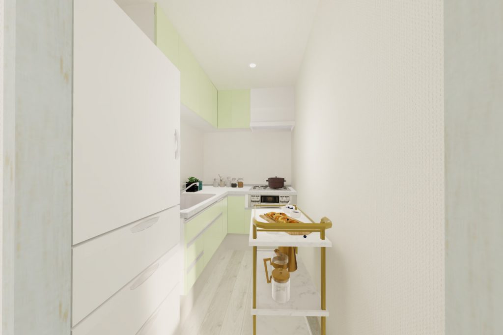 ペールグリーンの爽やかなL字型キッチンが素敵なので、そのままいかし、全体のテーマカラーにしました。