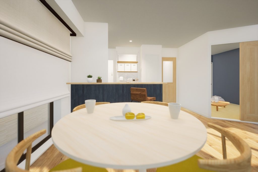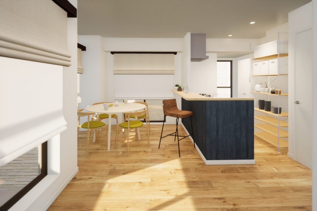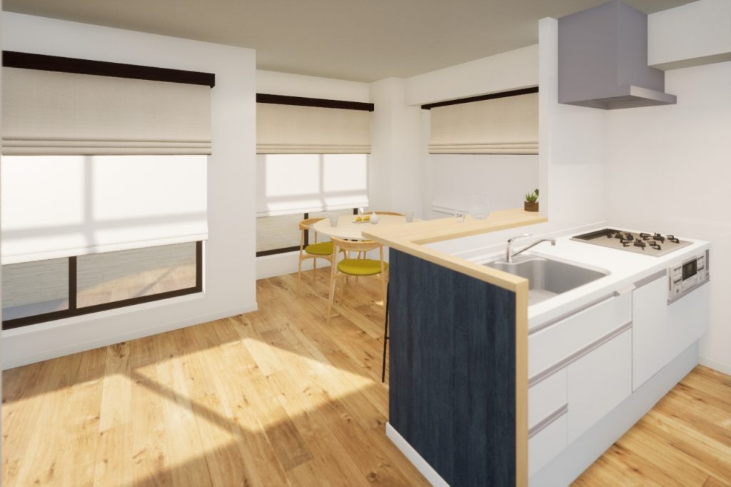 キッチンは対面タイプ。キッチン周りの腰壁の、青い木目調のクロスがアクセントになっています。