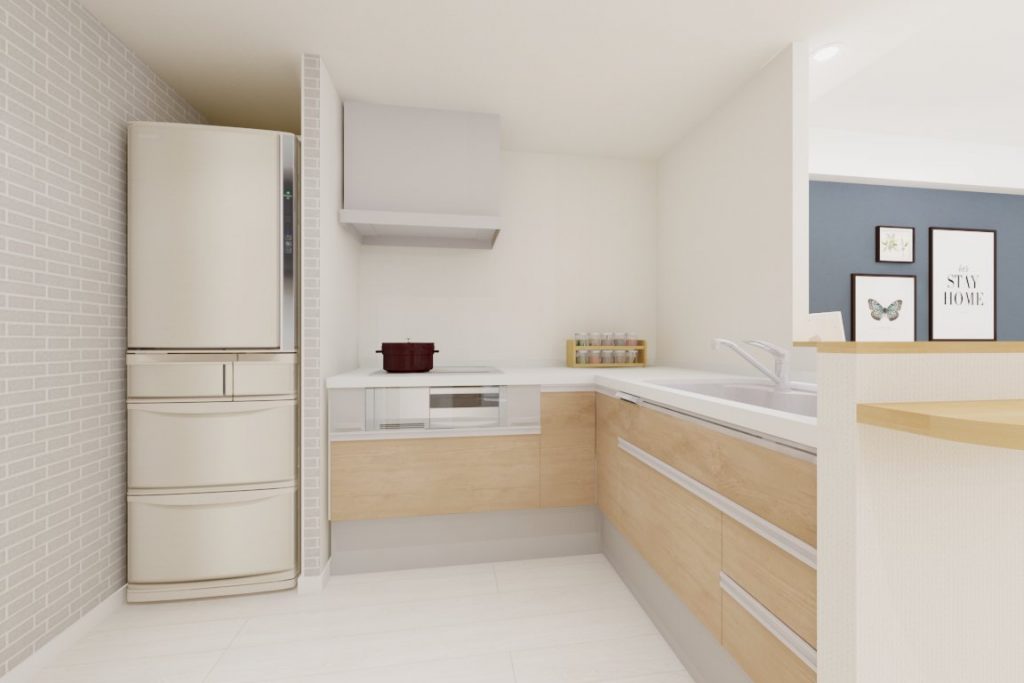 今回大きく変更したのは、キッチンスペース。キッチン上部の吊戸棚を撤去し、開放的なキッチンスペースに。