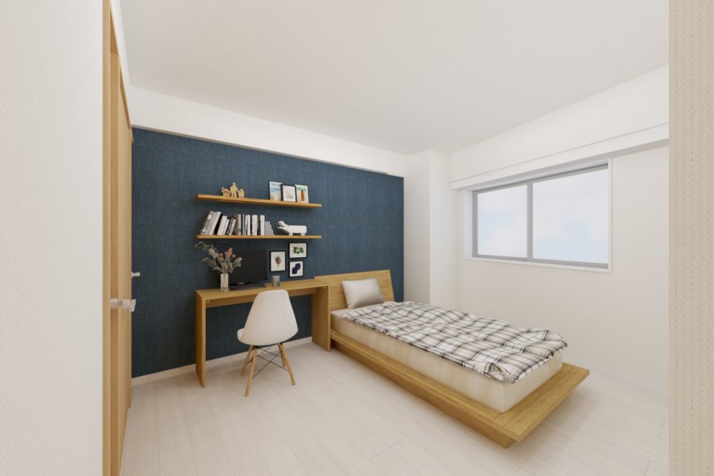 約6.2帖の洋室は、ネイビー色のアクセントクロスを貼って、空間に奥行きを感じるような目の錯覚を利用しました。