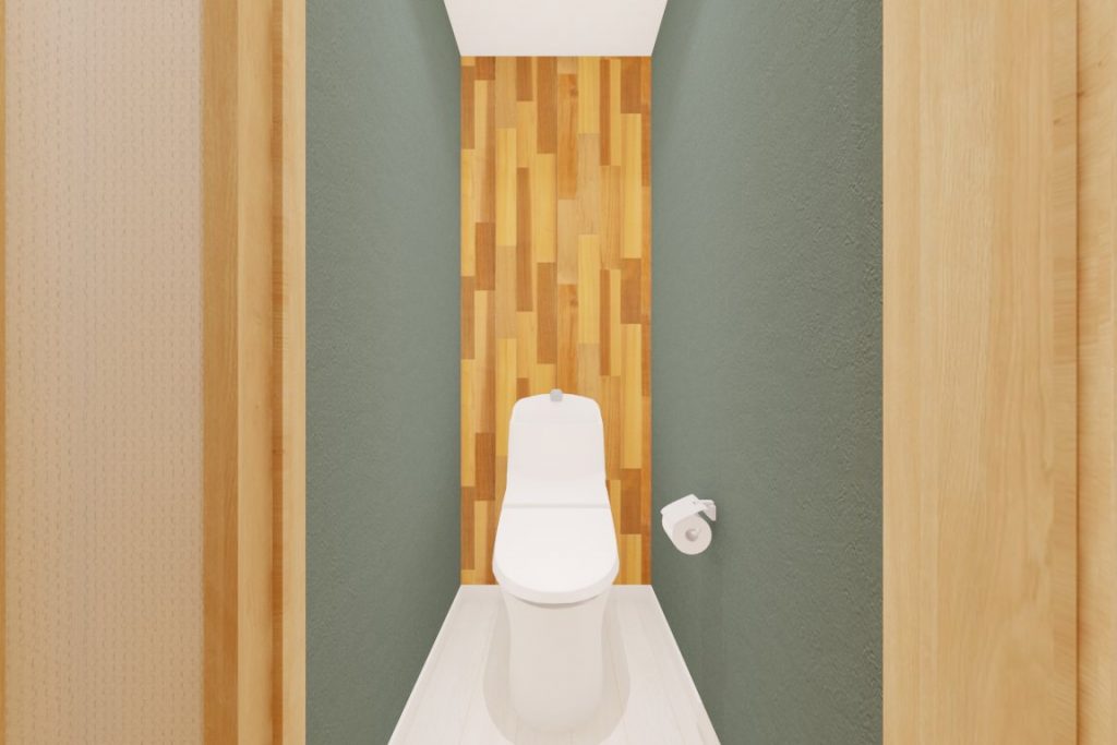 トイレは雰囲気をガラッと変えて、深緑色と木目デザインのクロスで自然を感じるようなテイストに仕上げました。