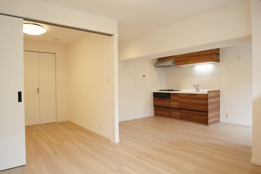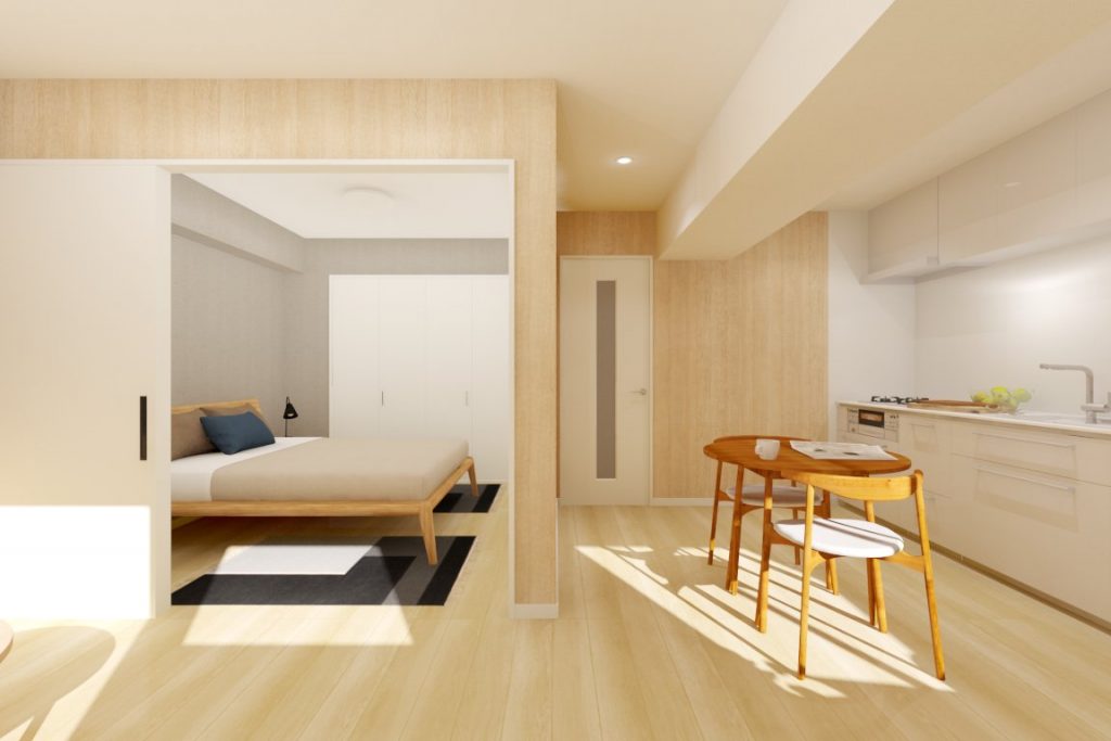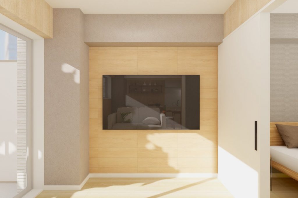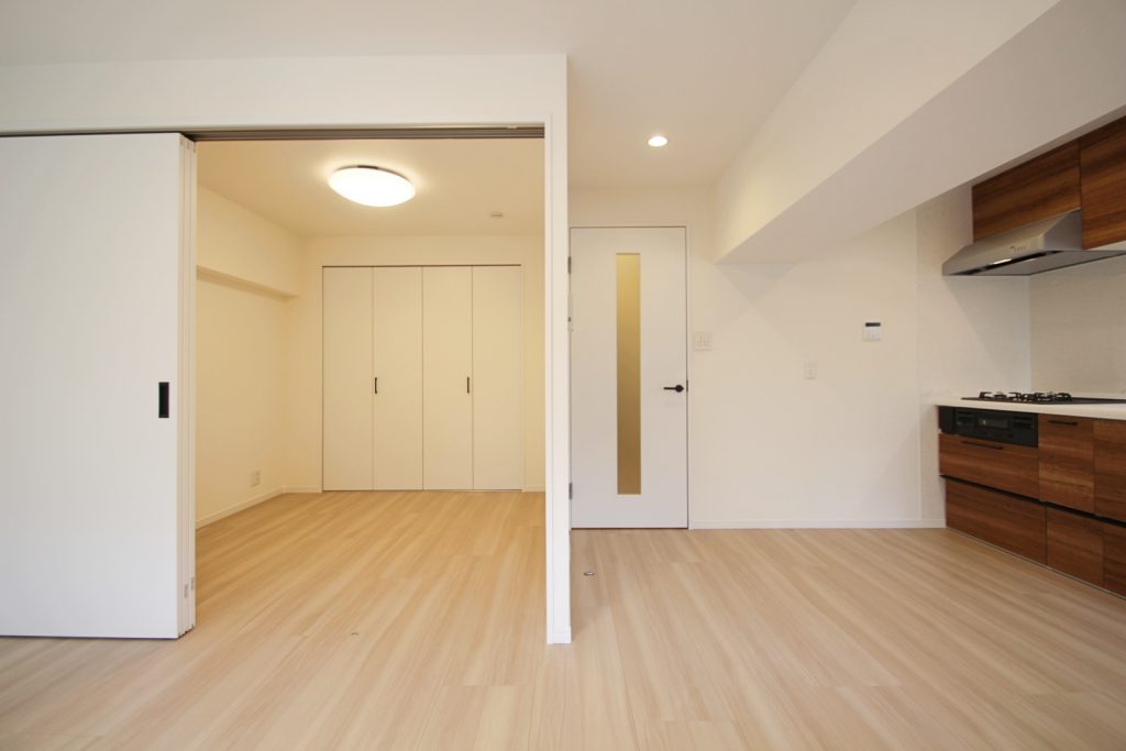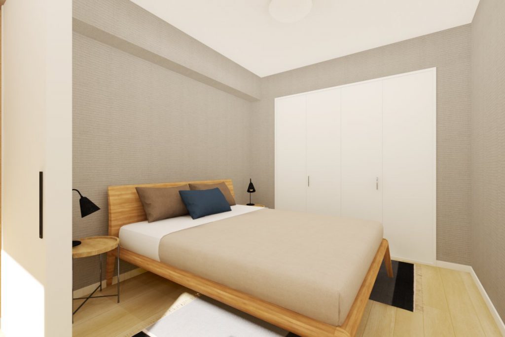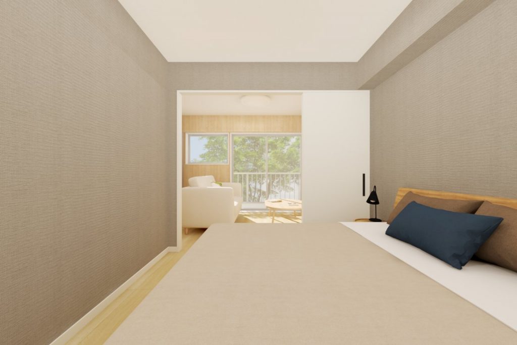 LDKの隣にある寝室は、リラックスできるよう落ち着いたトーンの壁紙に変更しました。