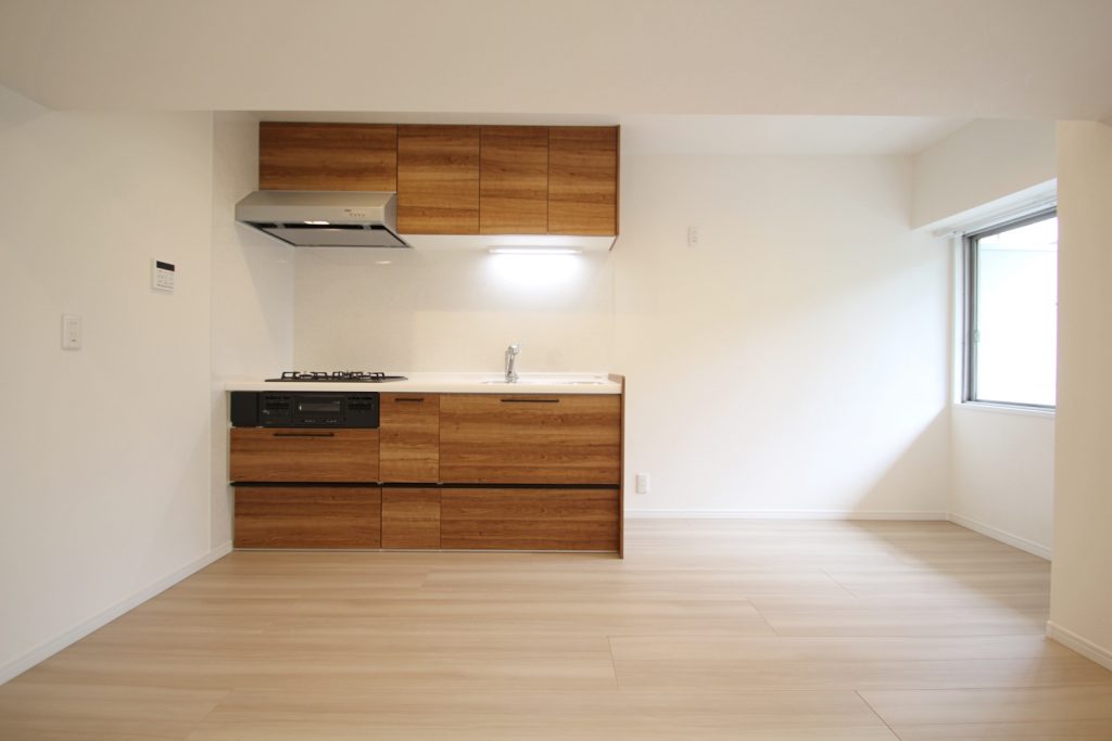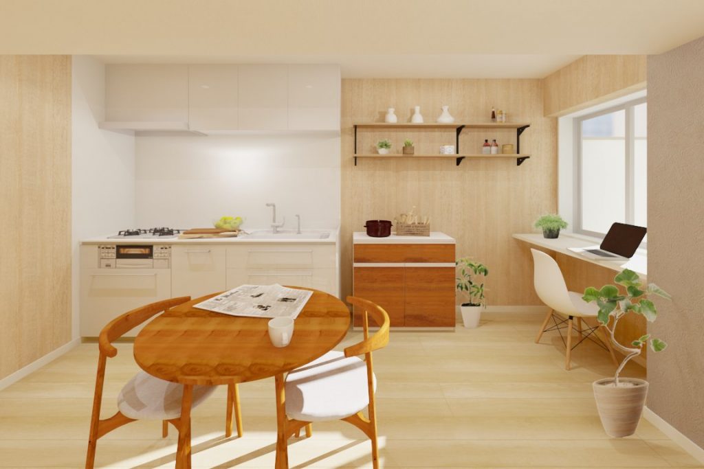 窓から見える景色と、インテリアとが調和するように、全体を木目調にしました。