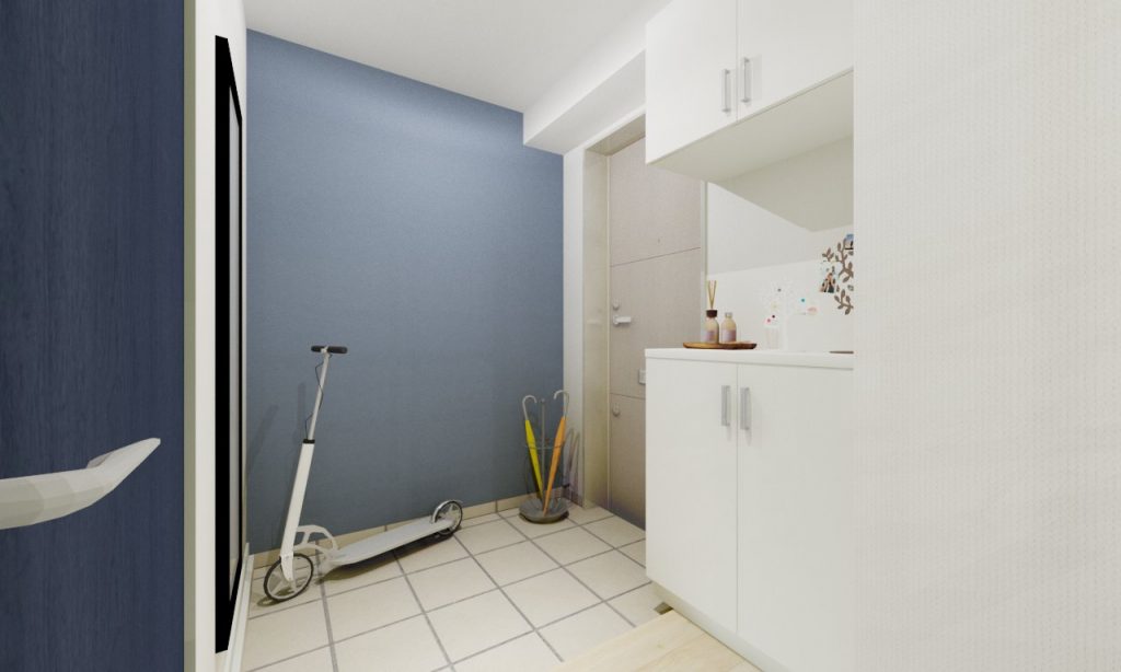 玄関もリビングや洋室同様に青色のクロスを貼り、家全体で統一感を持たせました。