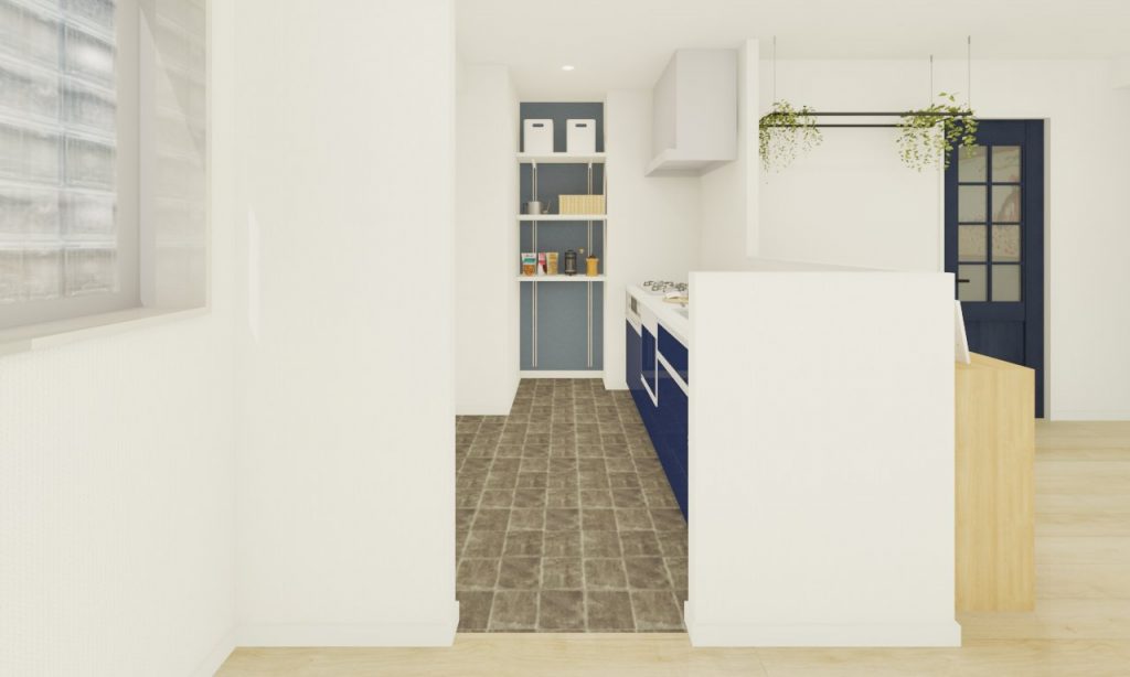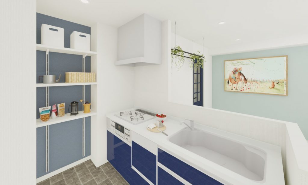 システムキッチンのデザインはクラシックブルーを選び、空間のアクセントとして一役買ってくれています。