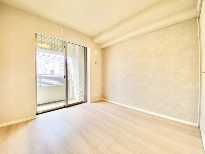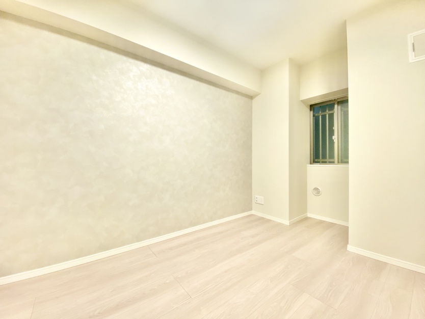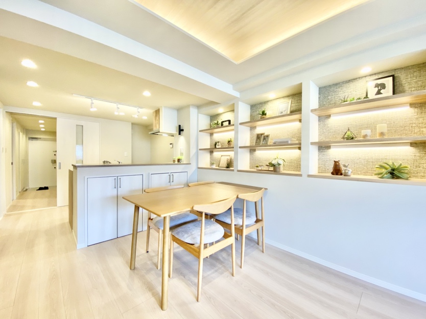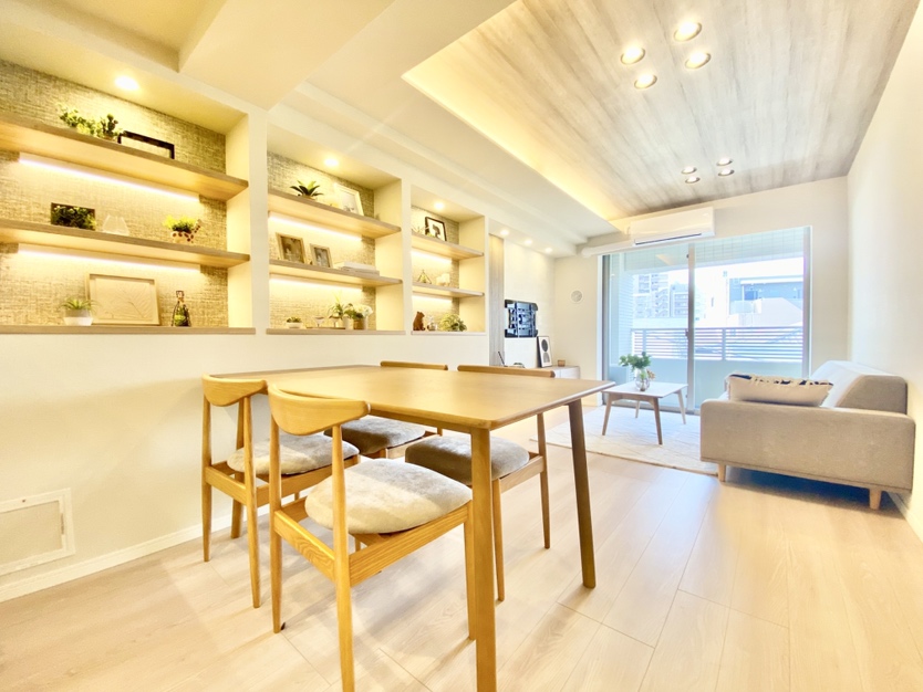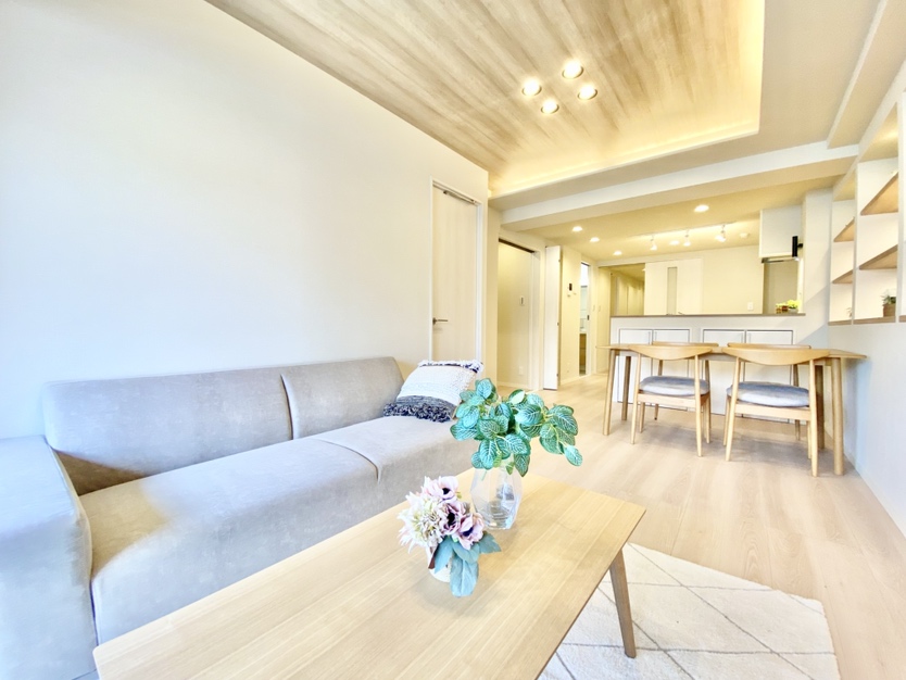 フルリノベーション済みで、ダウンライトが空間をやさしく照らす洗練された14.3帖のリビング。
