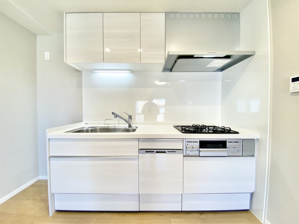 壁に沿ってすっきり収まるキッチンは、食洗器完備で家事もラクラク。