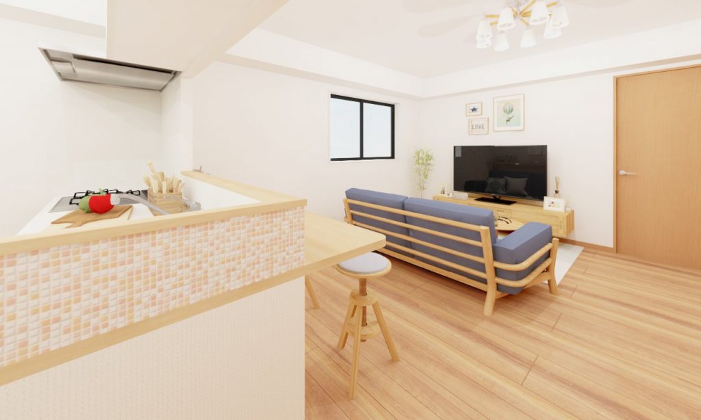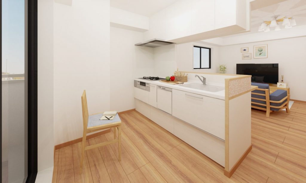 写真左奥のDKだった部分の壁を撤去し、対面キッチンに大変身!