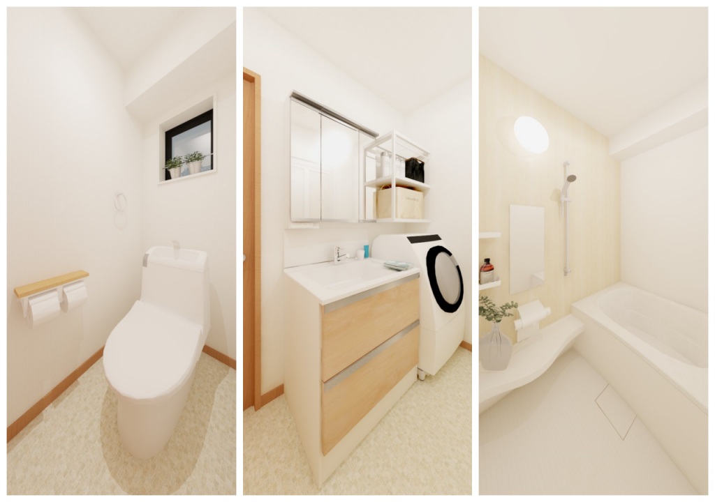 洗面とトイレは同じ床材を使うことで、普段よりスペースが広くなったように感じることができます。