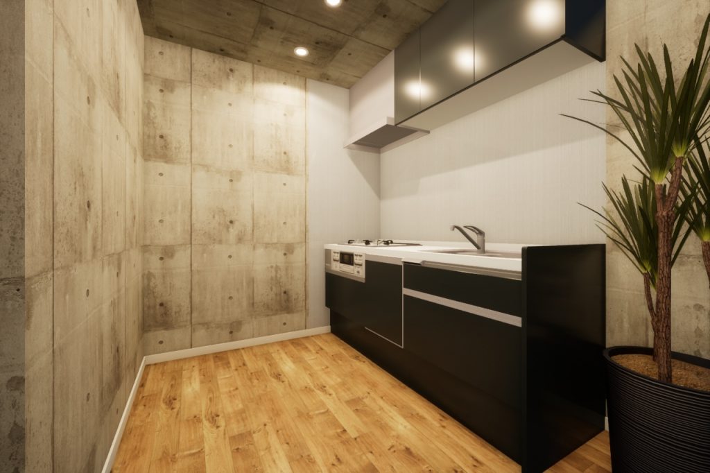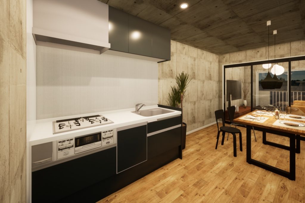 キッチンは部屋のテイストにあわせてブラックの扉を採用。