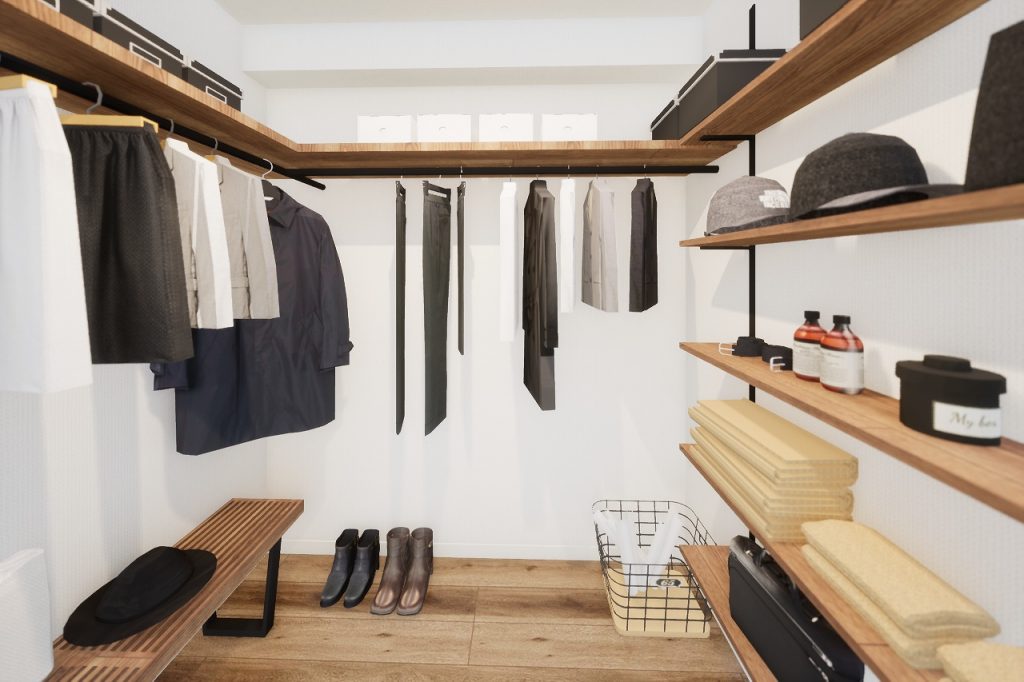 中にはL字にハンガーパイプを設置し、右側の壁は可動式の収納スペースにしました。