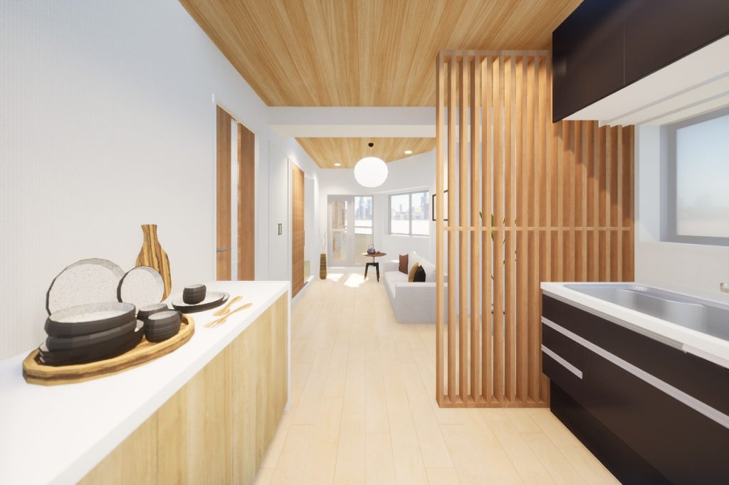 キッチン側から見ても、格子がゆるやかに空間を分けてくれるので、安心して料理ができますね。
