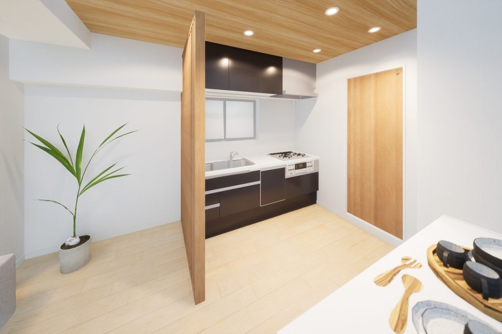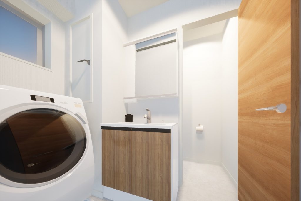 また、キッチンの隣の洗面所への扉は片開き戸から片引き戸に変更して、使いやすさも考慮しています。