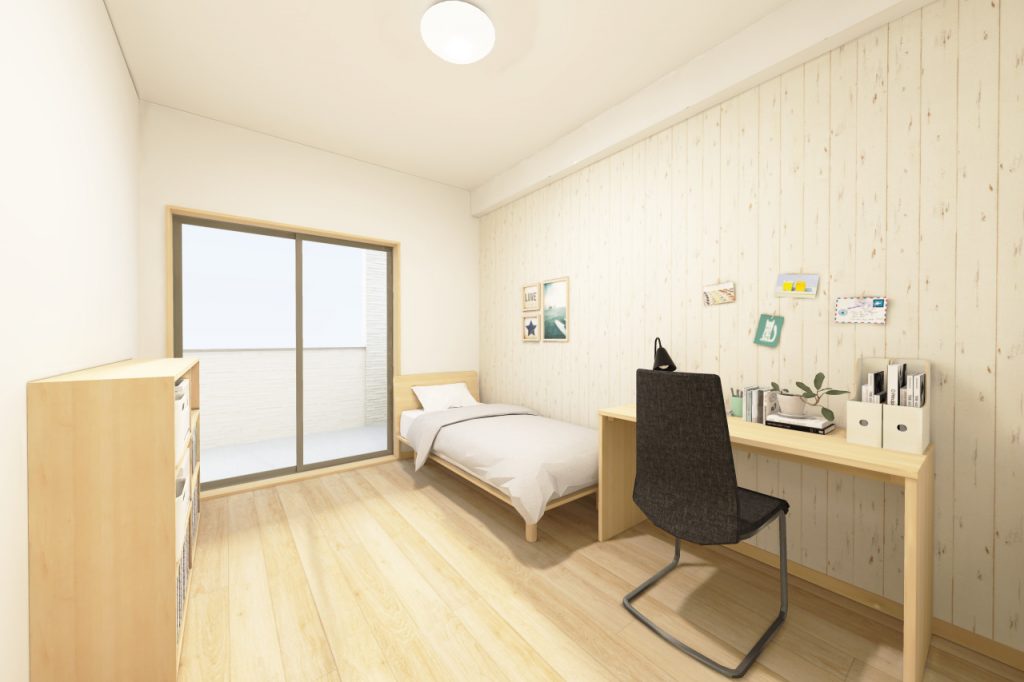 ベッドとデスクを置いてちょうどのサイズ感です。グリーンと相性が良い白木目もアクセントクロスを採用しました。