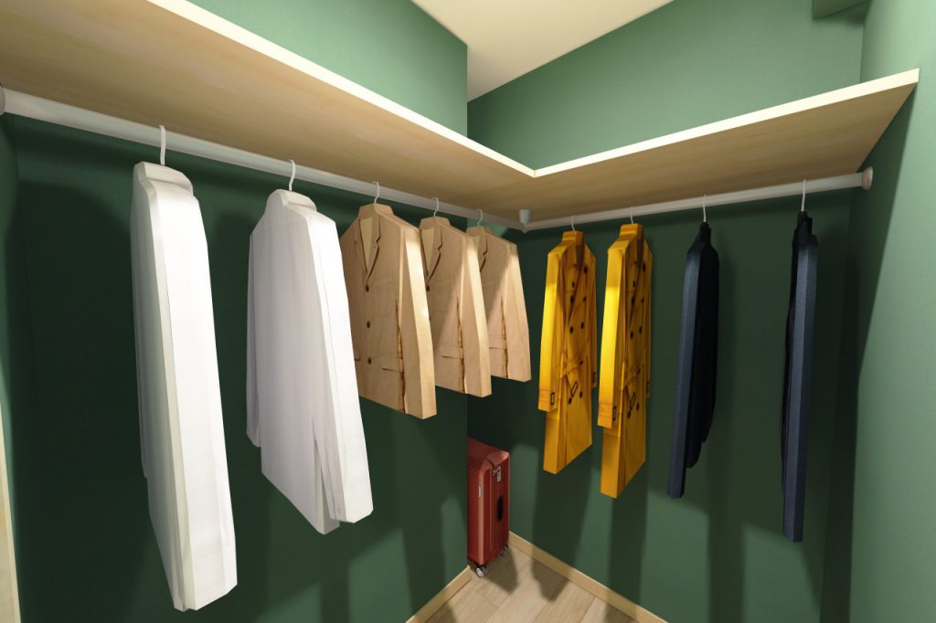間口いっぱいのマルチ収納があるお部屋でしたが、今回のプランではウォークインクローゼットとワークスペースに分けました。