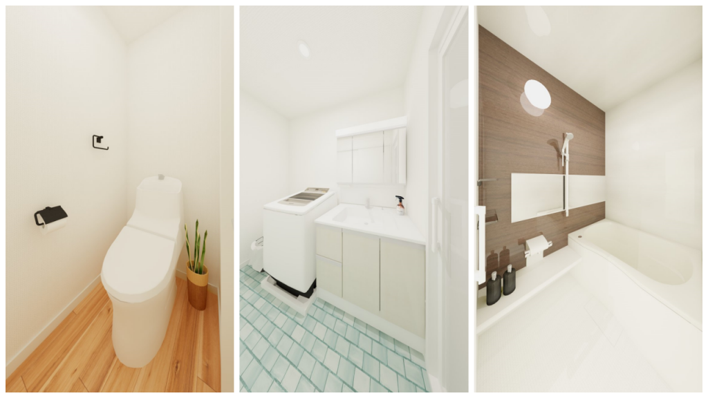 トイレの床材は、節ありのフローリング柄に。洗面は青い馬目地張りのクッションフロアを貼って清潔感を演出しました