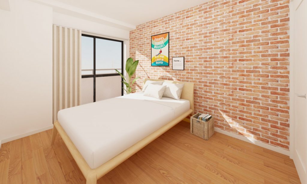 ヴィンテージ調のレンガクロスに、白いベッドが映えて温かみのある空間になりました