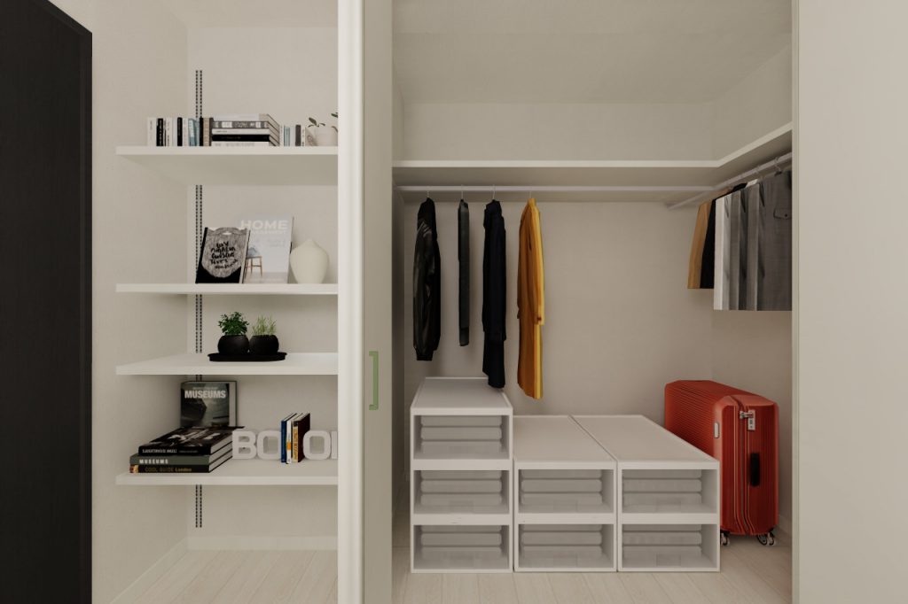押入だったところはクローゼットに変更し、隣の空間には可動棚を設置して見せる収納にしました。