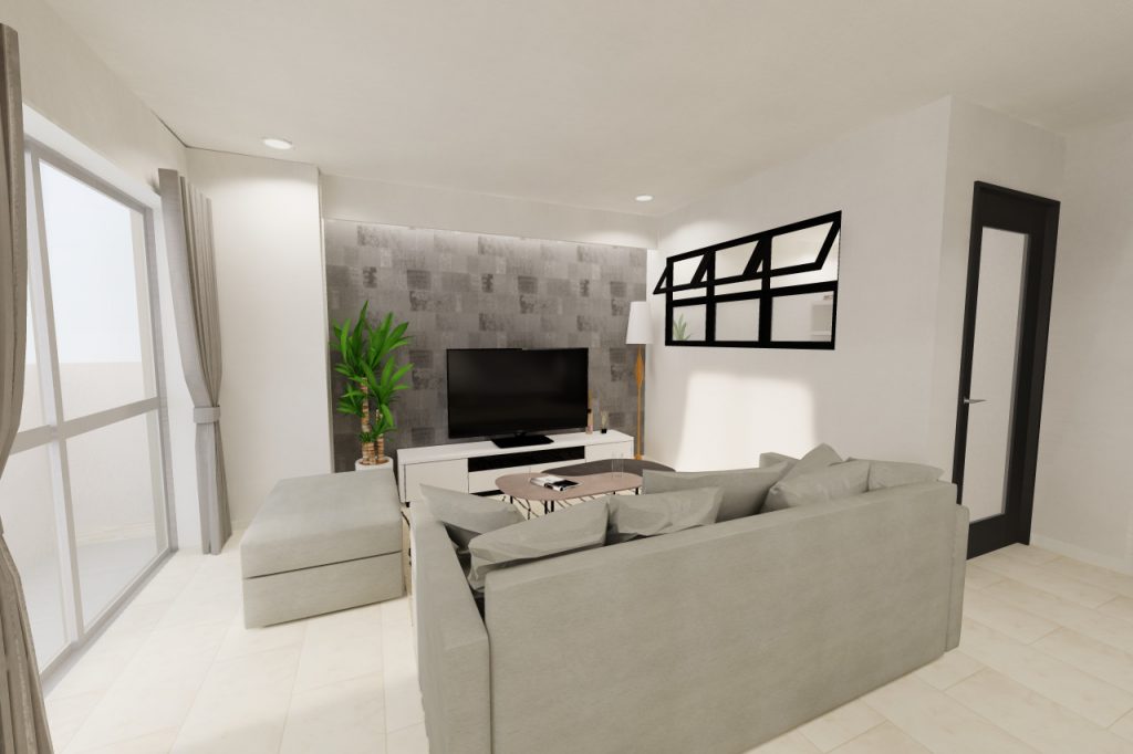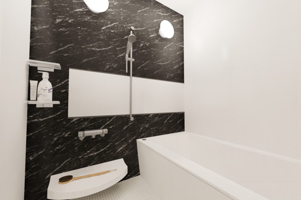 床は全体的に白系統の色柄で明るく見えるようにして、建具や設備・アクセントクロスにシックな濃色を取り入れて空間を引き締めています。
