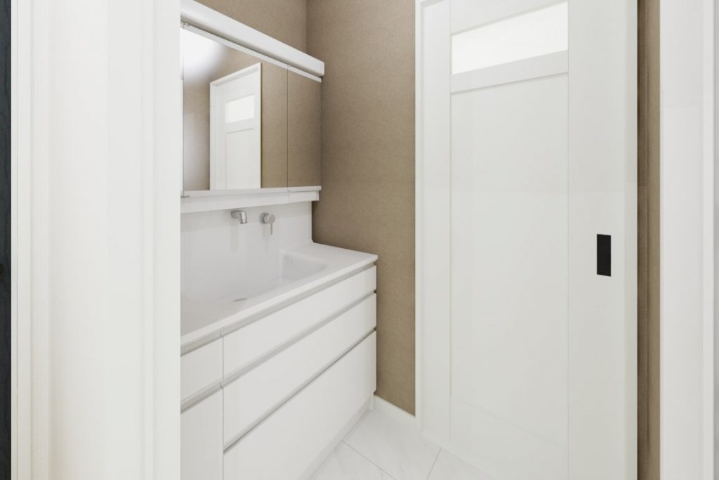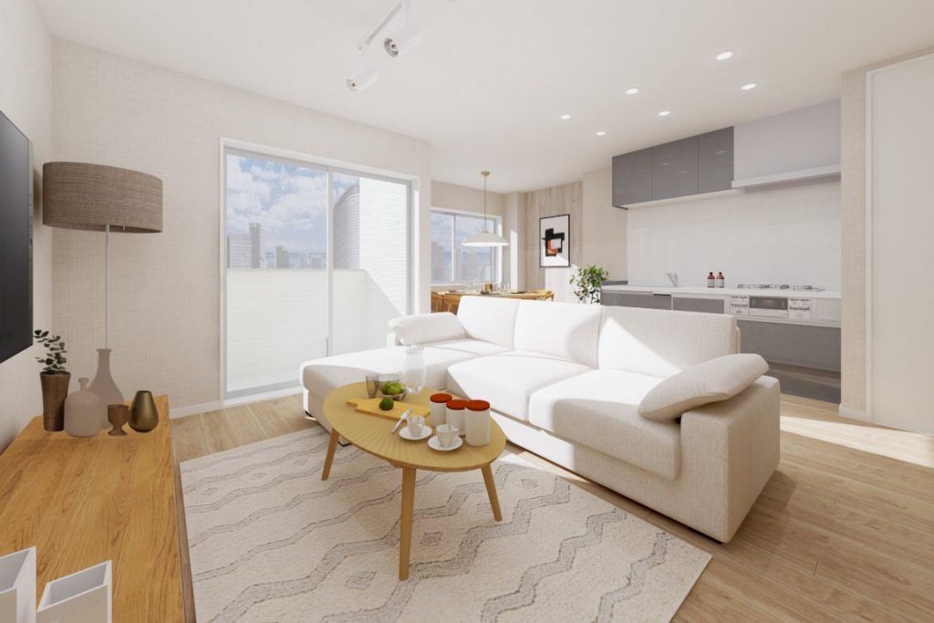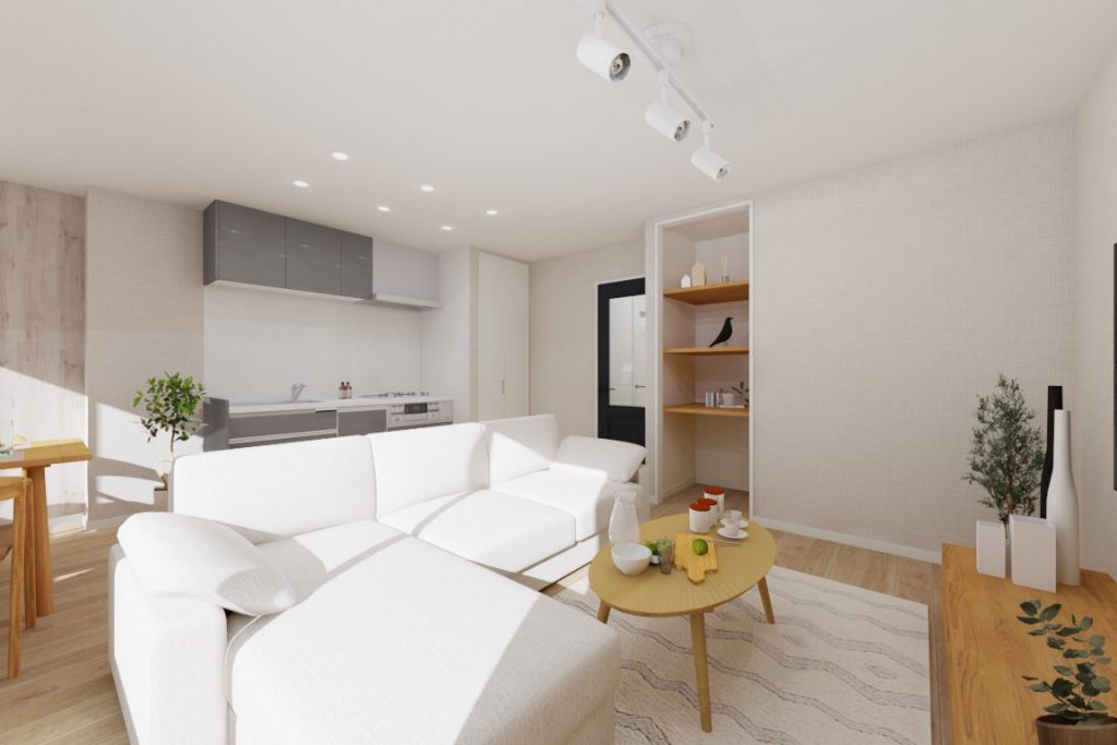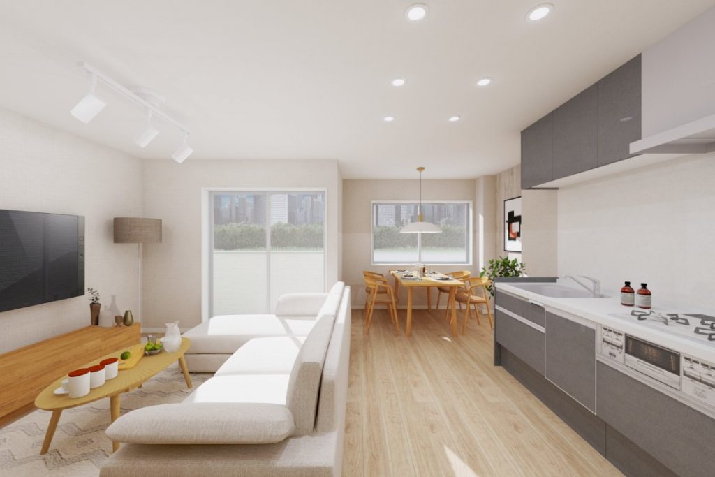 壁や床、キッチンなどを、グレイッシュトーンで統一したプランです。