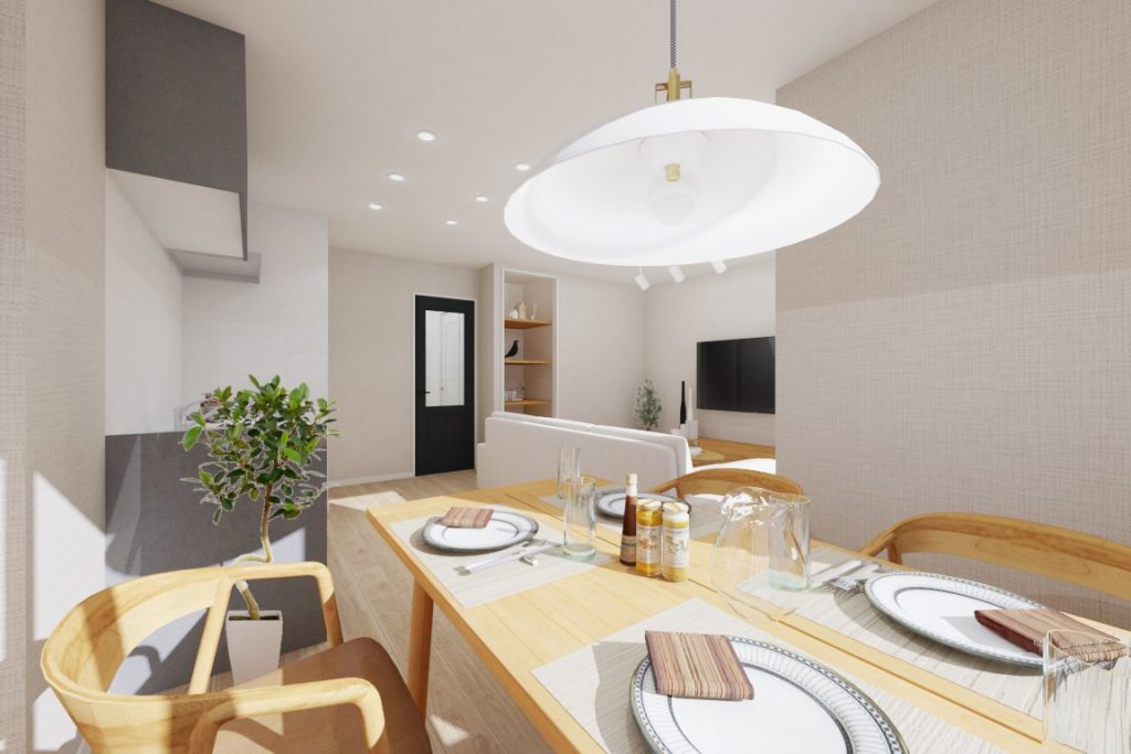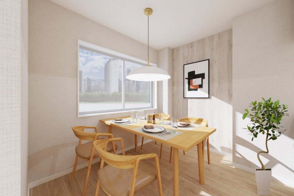 ダイニングスペースの一面だけに、グレーの木目調のクロスをアクセントに使用しました。