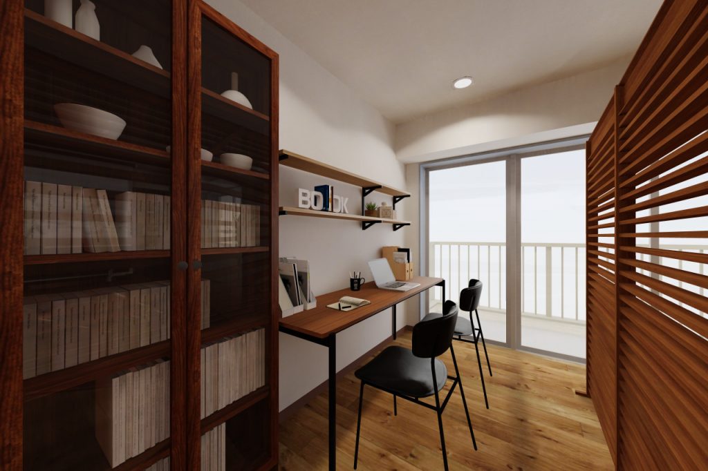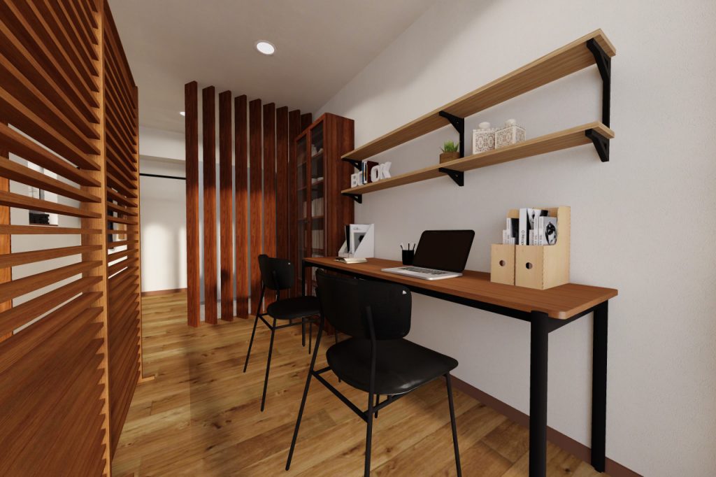 玄関横には本棚やカウンターテーブルを置いてワークスペースにしています。