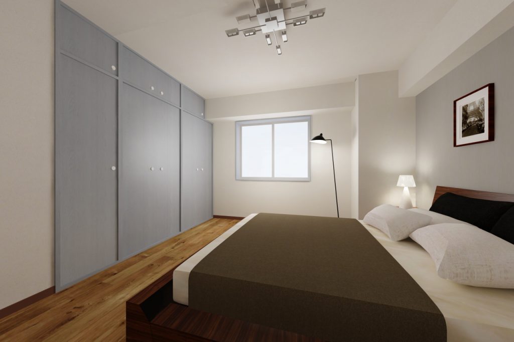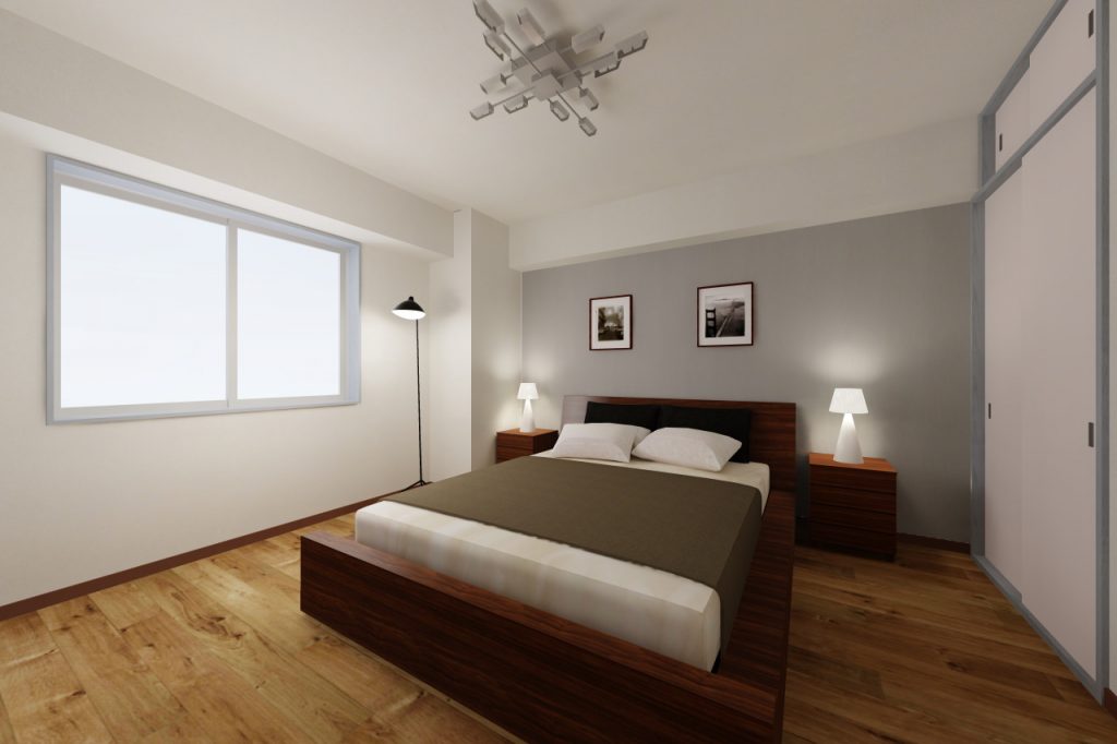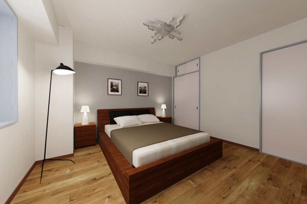 アクセントクロスは既存の建具枠の色と合うように主張しすぎないグレーを採用し、落ち着いた空間に仕上げています。