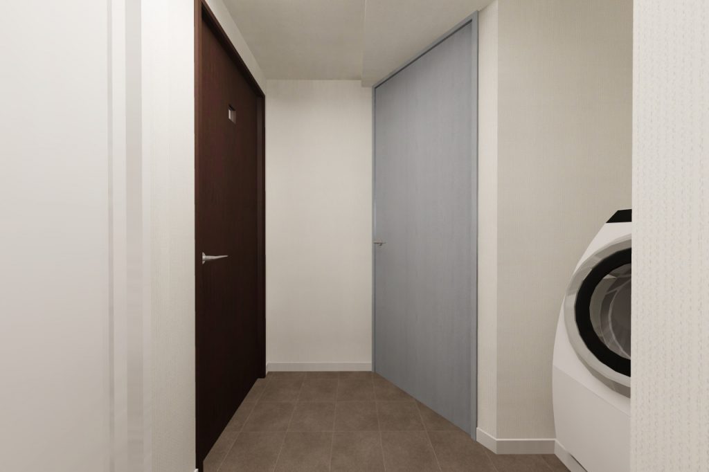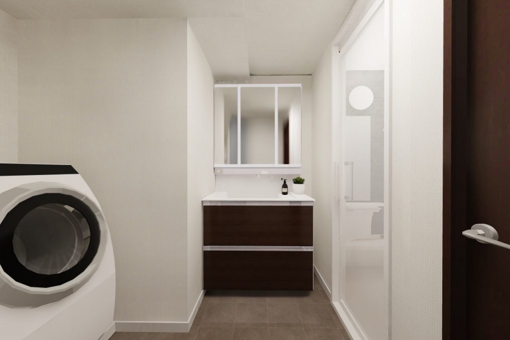 コンパクトな洗面室を少しでも広くするため、斜めの位置に壁と建具を設けました。