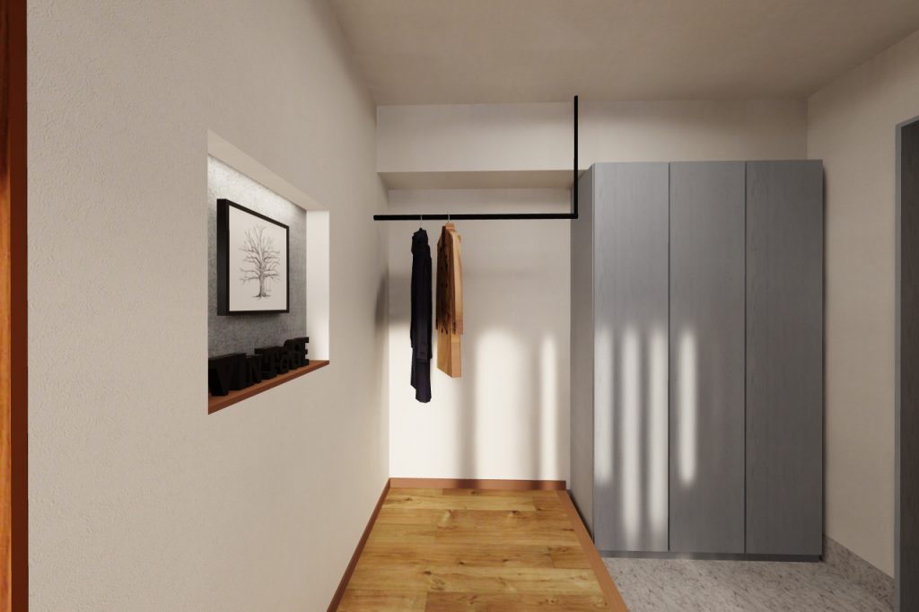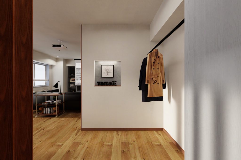 スペース内には、シューズクロークとアウターを掛けられるハンガーポール。