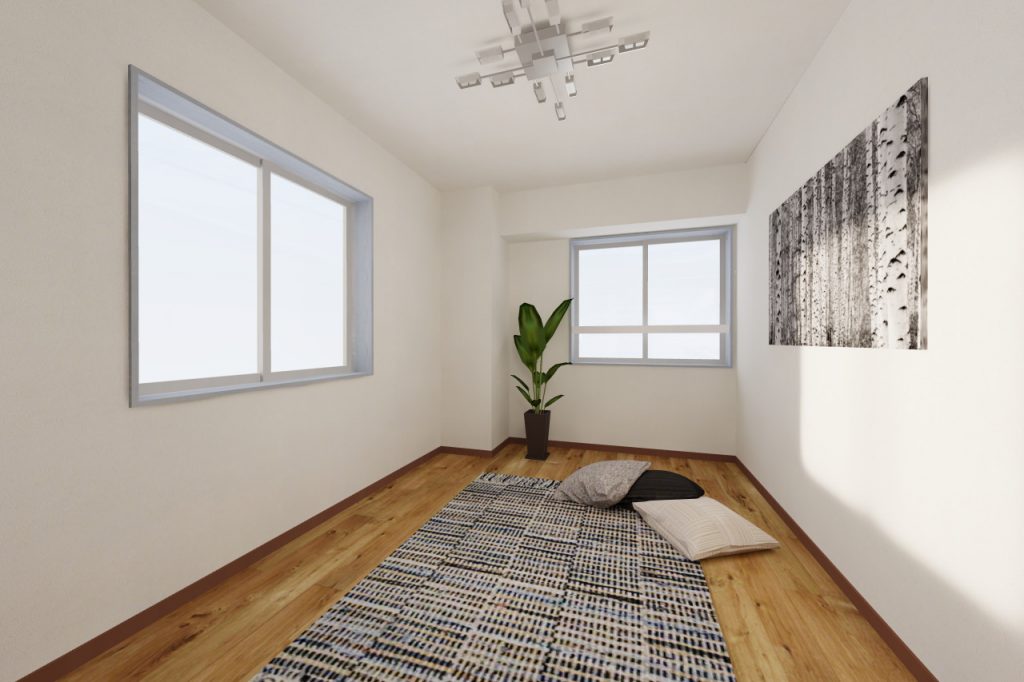 リビングはこんな感じ。左壁の腰窓は先程のワークスペース同様に南向きです。