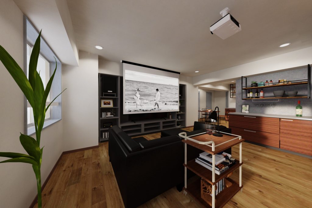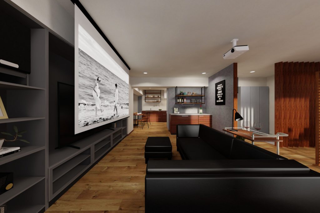 そして映画やスポーツ観戦を楽しみたくなったら、天井からスクリーンを下ろして家族やお友達と観賞を楽しむことができます!